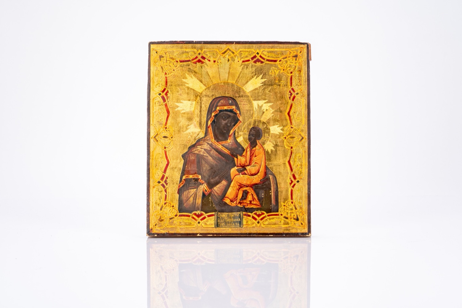 Icona a fondo oro e tempera su tavola raffigurante la Madre di Dio di Tichvin. Russia, inizio XX secolo