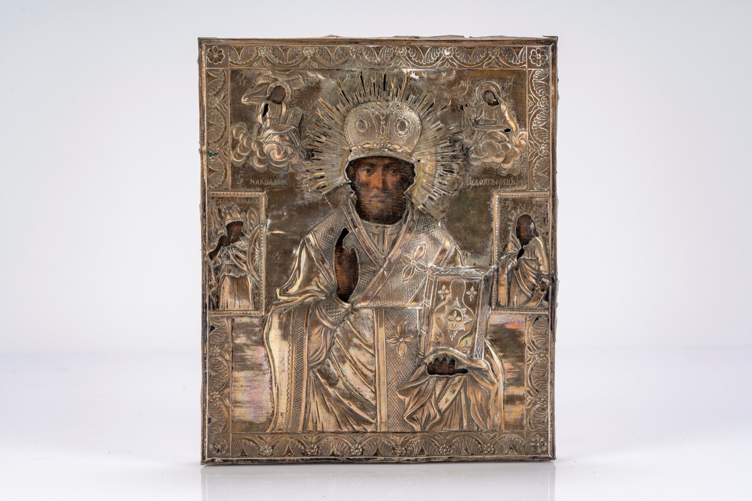 Icona su tavola con riza in argento raffigurante san Nicola tra santi. Russia, XIX secolo