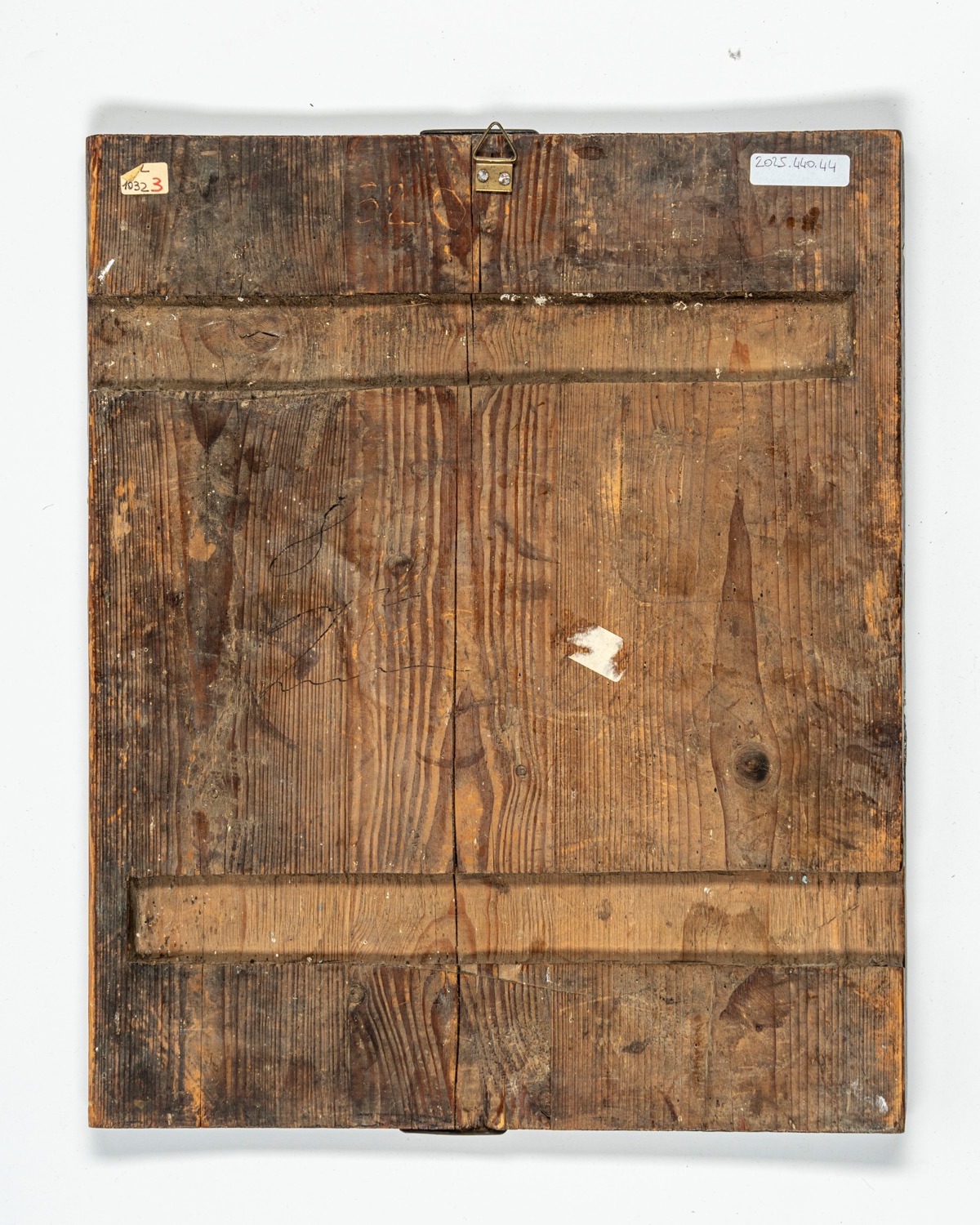 Con cornice non pertinente in legno dipinto e argentato, decorata a volute a rilievo (cm 85 × 73,5).