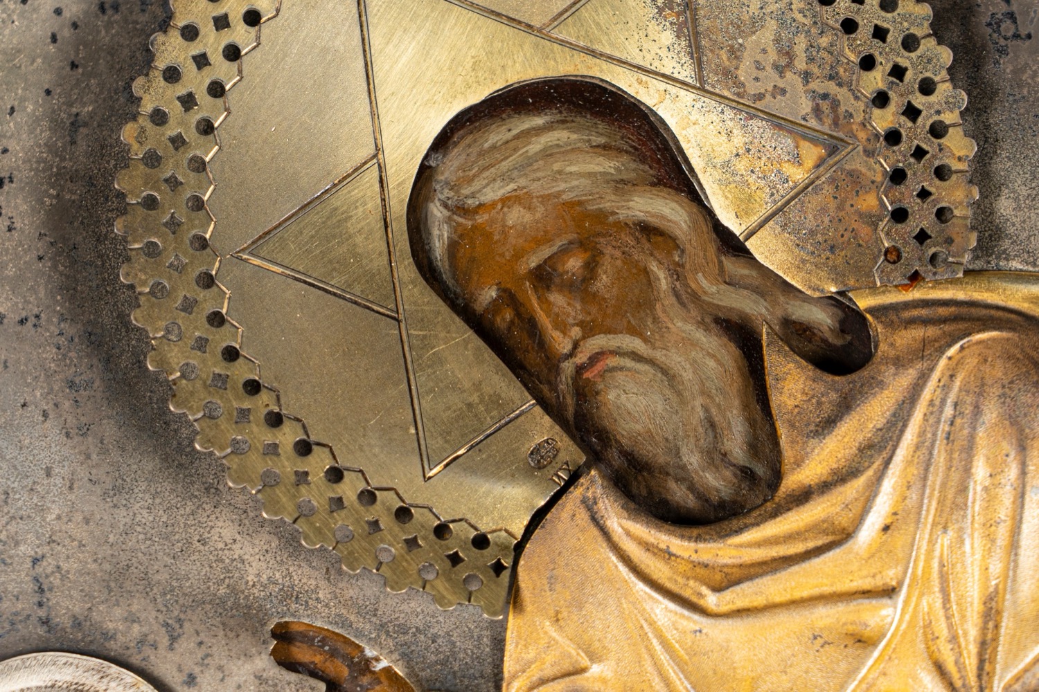 Il crocifisso è ricoperto da un rivestimento in lamina d’argento e argento dorato che lascia scoperti il corpo di Gesù, reso con realismo, il volto e le mani di Dio Padre, sotto il quale appare la sigla “ІНЦІ” (Gesù il Nazareno, il Re dei Giudei). Accanto al corpo di Cristo la lancia e la spugna; ai suoi piedi, sul monte del Golgota, si apre la caverna resa nei dettagli naturalistici con il teschio di Adamo, simbolo dell’umanità redenta con il sacrificio di Cristo. Il panneggio in argento, argento dorato e cesellato è reso con grande naturalismo nelle sue pieghe; le aureole sono aggettanti e con bordo traforato.Reca punzoni dell’argentiere Khlebnikov con emblema imperiale e dell’assaggiatore Anatoly Apollonovich Artsybashev, Mosca, 1890.