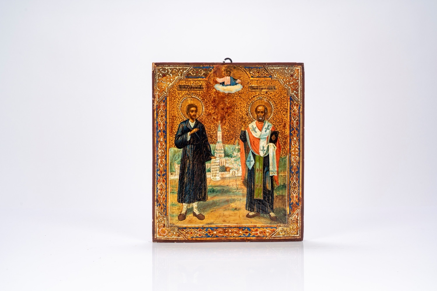 Lievi difetti e restauri.I santi sono raffigurati in un paesaggio con cattedrale (probabilmente la Chiesa di san Simeone il Giusto e di Anna la Profetessa, San Pietroburgo), sormontati da Gesù Cristo benedicente. Bordura a finti smalti policromi e motivi stilizzati.