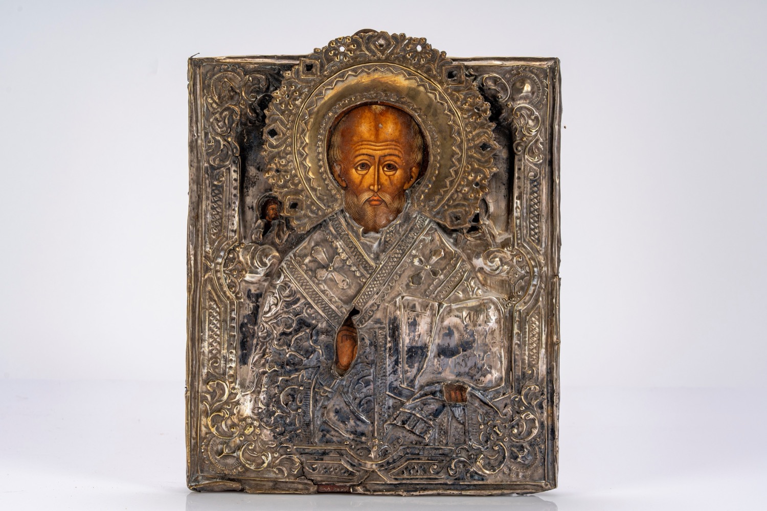 Icona a tempera su tavola con riza in argento raffigurante san Nicola benedicente tra santi. Russia, XIX secolo