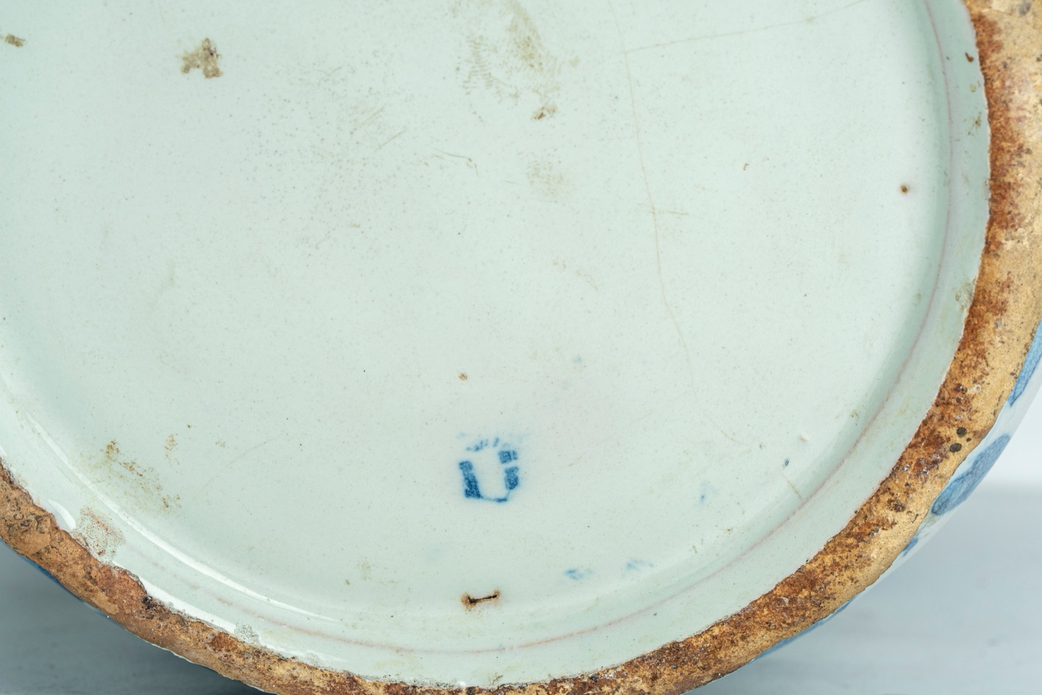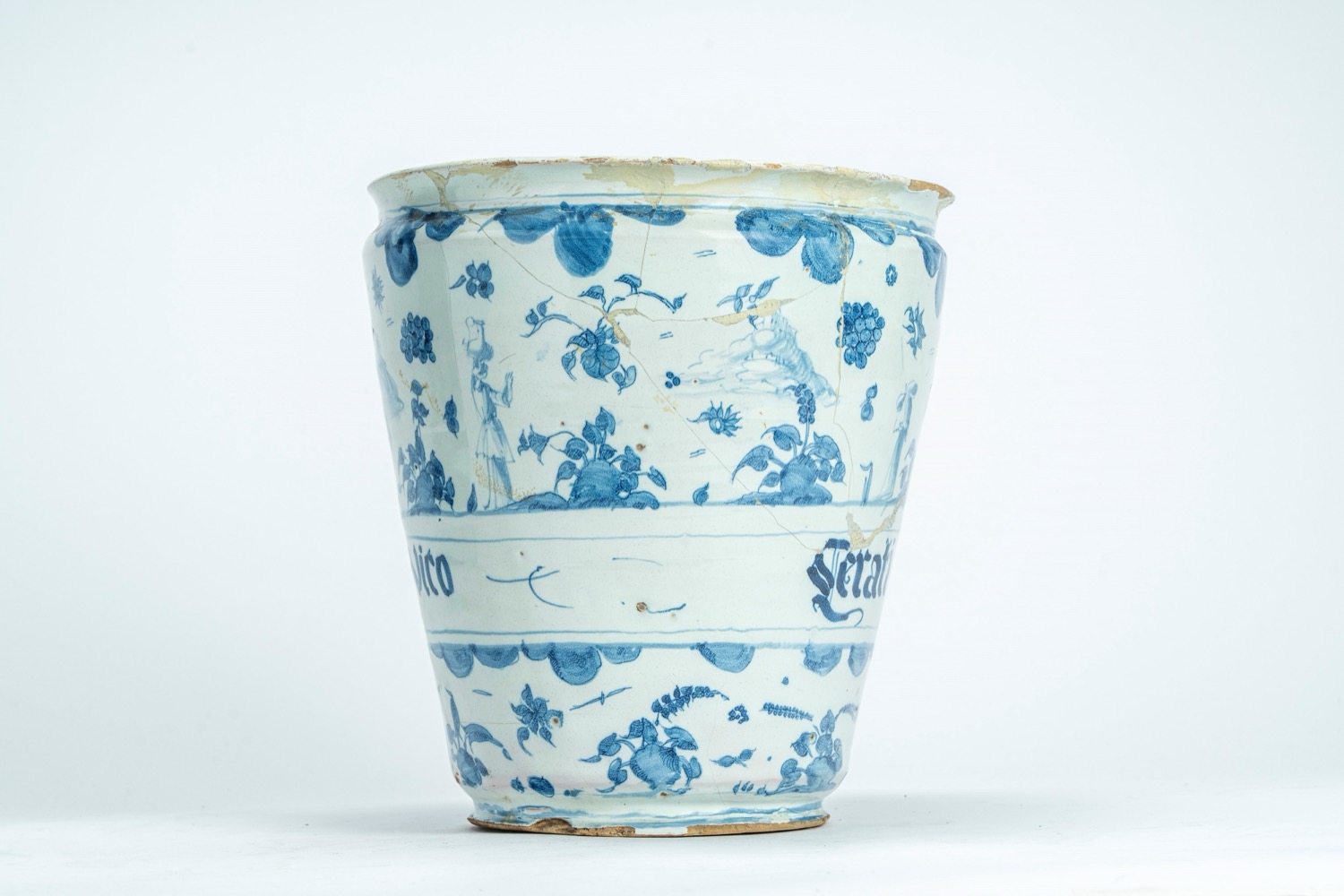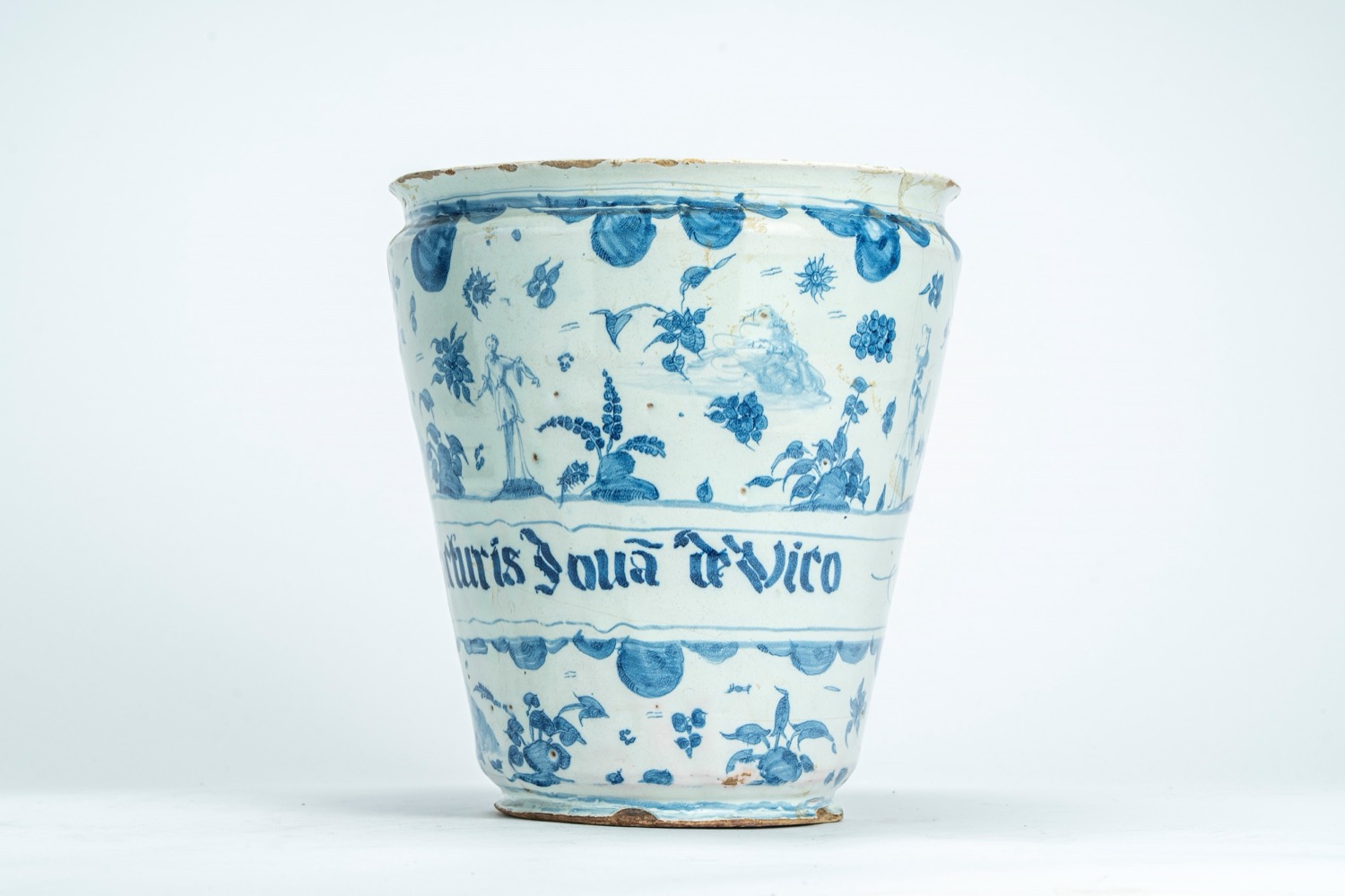 Per un'ipotesi di confronto si rimanda al vaso conservato alla Pinacoteca Civica di Savona e pubblicato in Ceramiche della tradizione ligure. Thesaurus di opere dal Medio Evo al primo Novecento, a cura du Cecilia Chilosi, 2011, Milano, fig. 241, p. 202Fondo decorato da nuvole, elementi vegetali, alture e figurette disseminate su tutta la superficie.