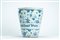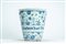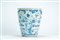 Vaso tronco conico da farmacia in maiolica con decoro orientalizzante "a tappezzeria" in blu di cobalto con figura eretta di San Paolo con spada e libro contro cartiglio apotecario a caratteri gotici "Pro Fracturis Iouā de Vico". Probabilmente Savona, secolo XVII
