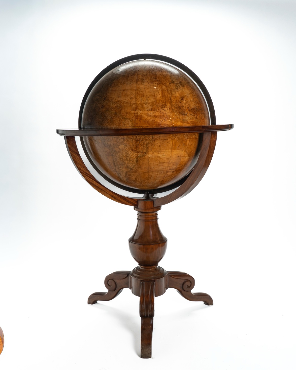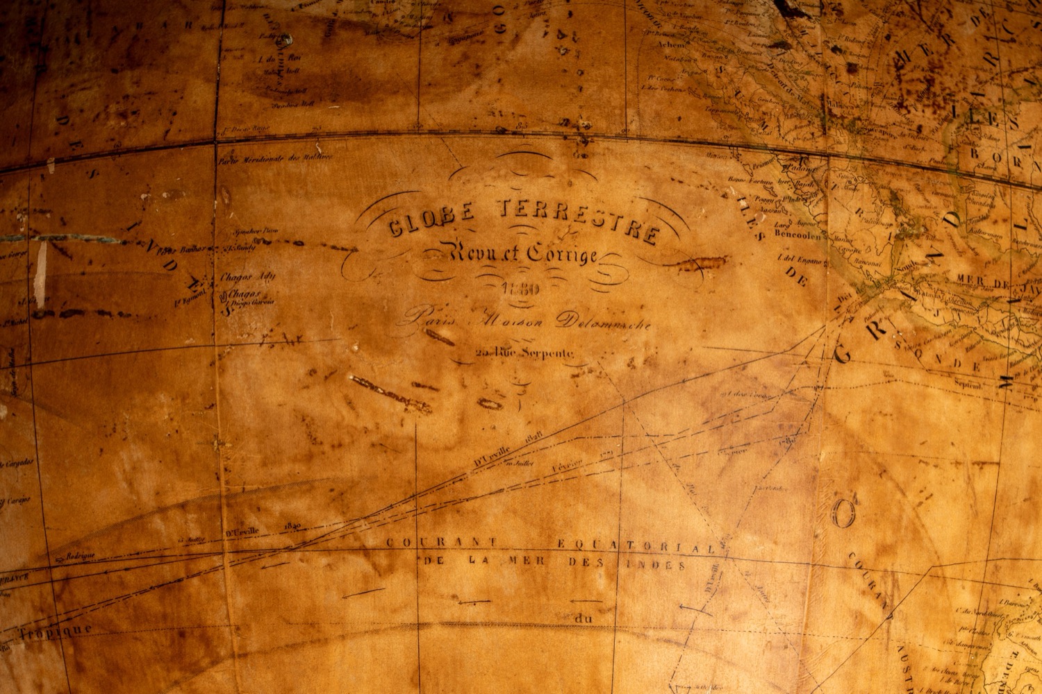 Maison Delamarche, Parigi, 1880. Imponente globo terrestre da terra con sostegno tripode in legno tornito di epoca successiva
