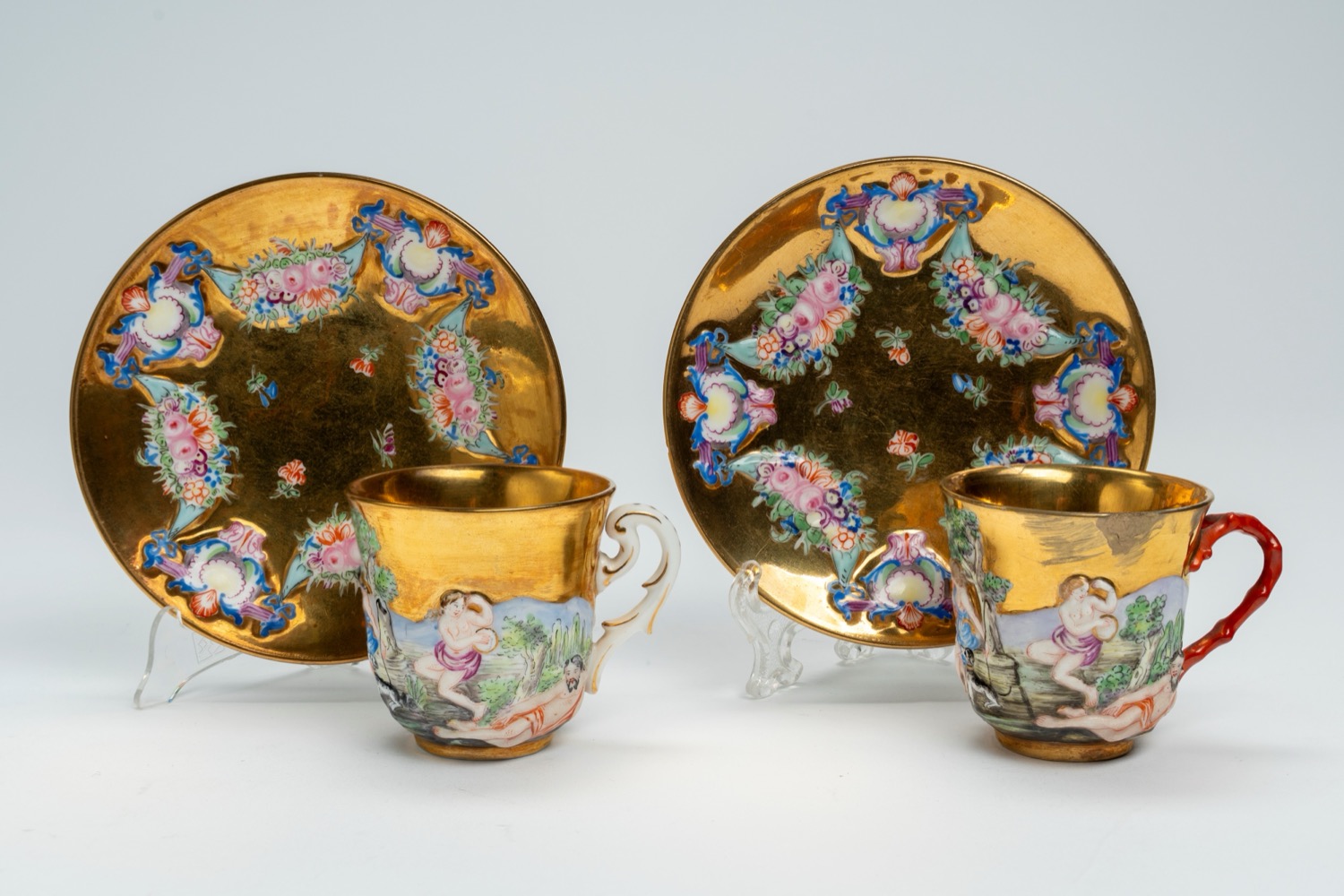 Le tazzine decorate con scene classiche, i piattini con ghirlande di fiori. Una tazzina con ansa a finto corallo, l’altra con ansa a voluta. Difetti e restauri.Le tazzine decorate con scene classiche, i piattini con ghirlande di fiori. Una tazzina con ansa a finto corallo, l’altra con ansa a voluta. Difetti e restauri.