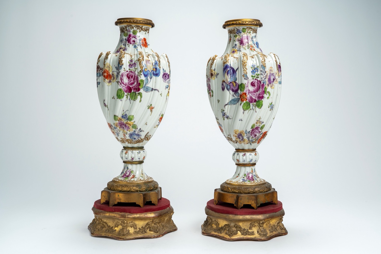 Coppia di vasi in porcellana a torchon decorati in policromia a fiori e con dorature a rilievo. Manifattura di Höchst, secolo XIX