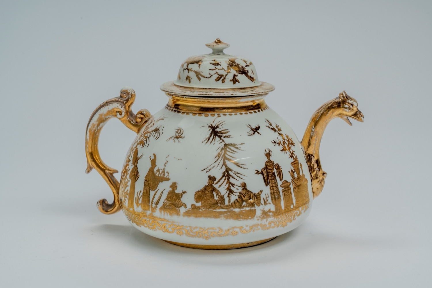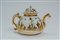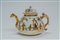 Teiera dal corpo globulare con ansa a voluta, beccuccio a testa di aquila, presa del coperchio a trottola. Mancanze alla doratura, un piattino restaurato.Teiera dal corpo globulare con ansa a voluta, beccuccio a testa di aquila, presa del coperchio a trottola. Mancanze alla doratura, un piattino restaurato.