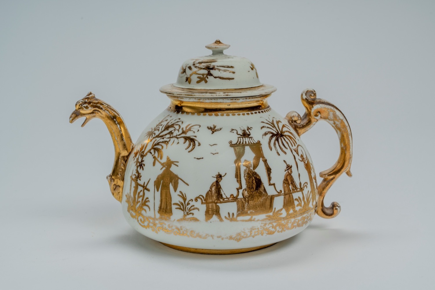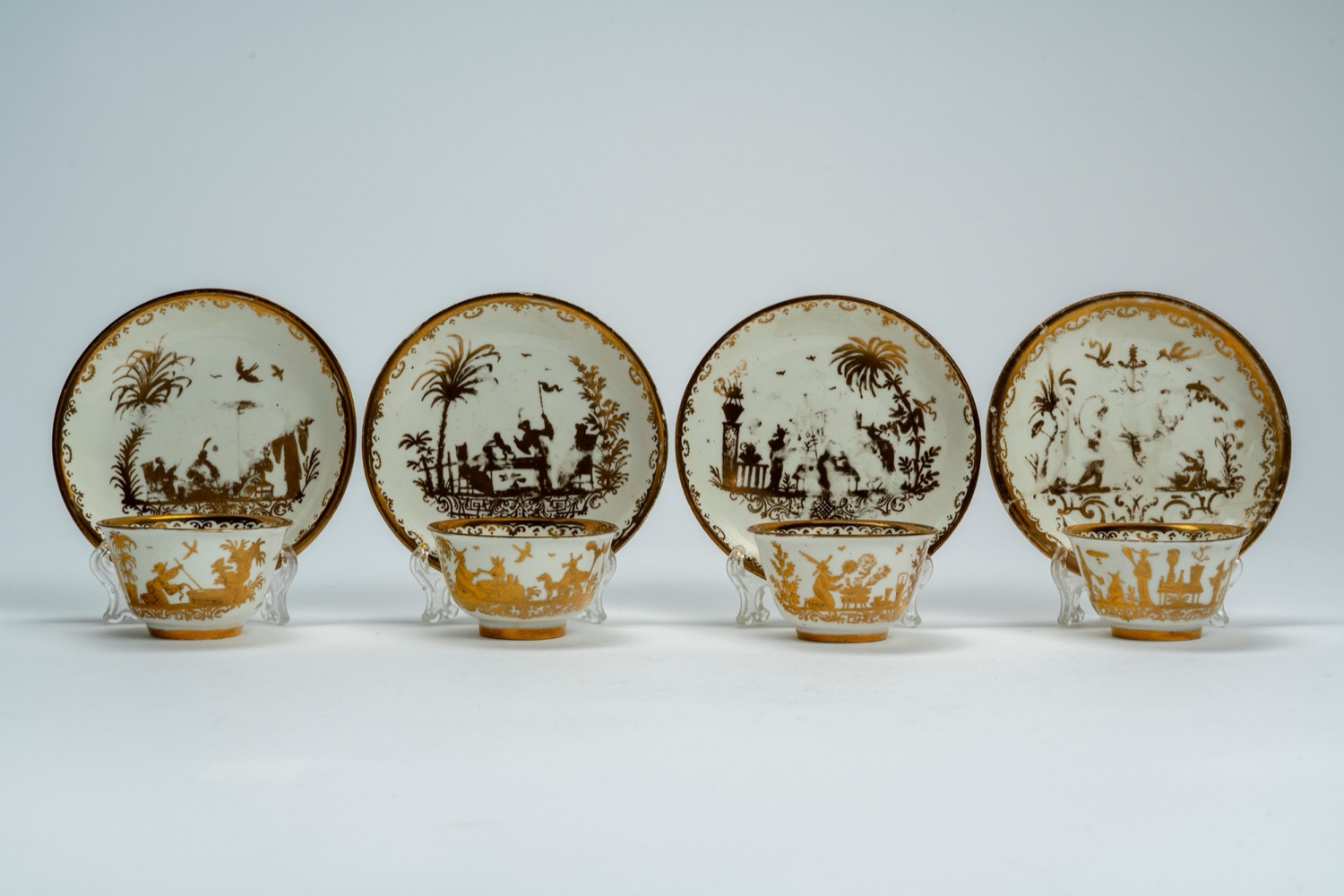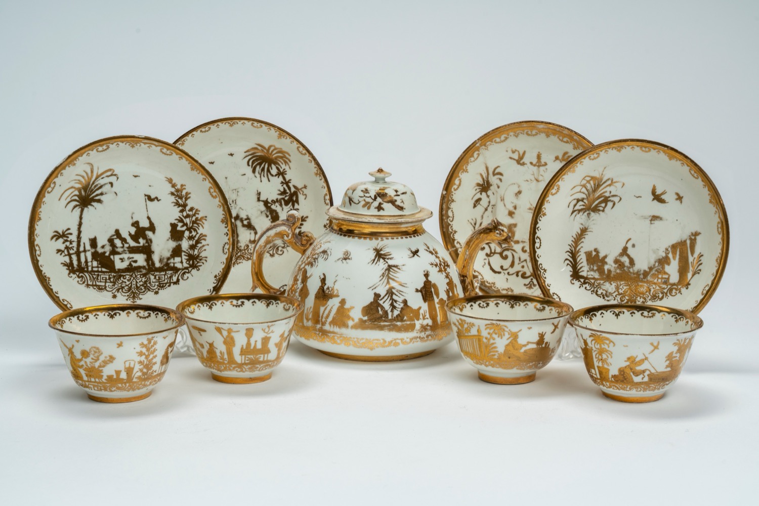 Servizio da tè composto da teiera e quattro tazzine con piattino in porcellana dorata decorata a chinoiserie. Manifattura di Meissen, 1720 circa (porcellana), Augsburg, probabilmente Abraham Seuter, 1725-1730 circa (decorazione)
