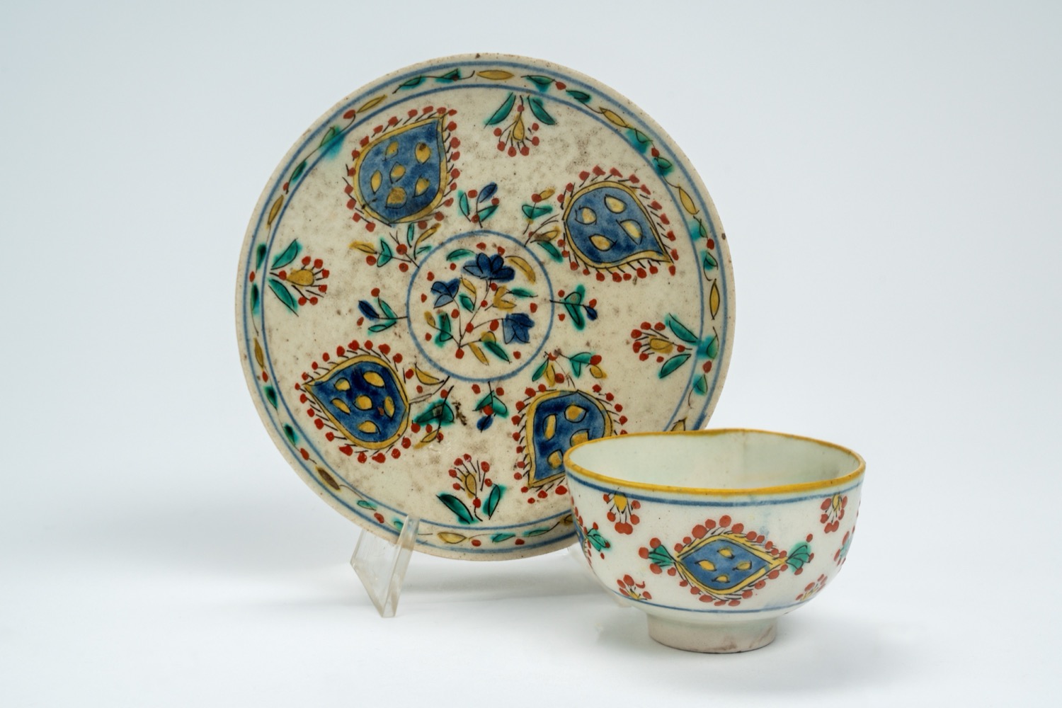 Fincan con piattino in maiolica a smalto stannifero decorato in policromia. Turchia ottomana, Kütahya, fine secolo XVIII/inizio secolo XIX