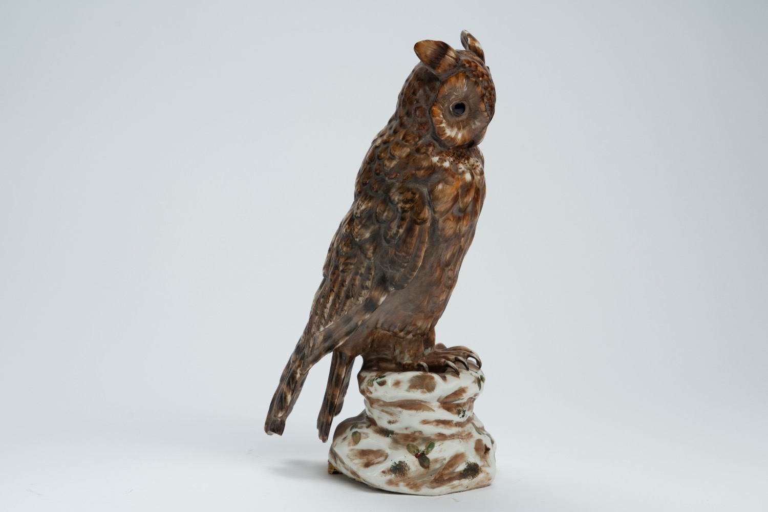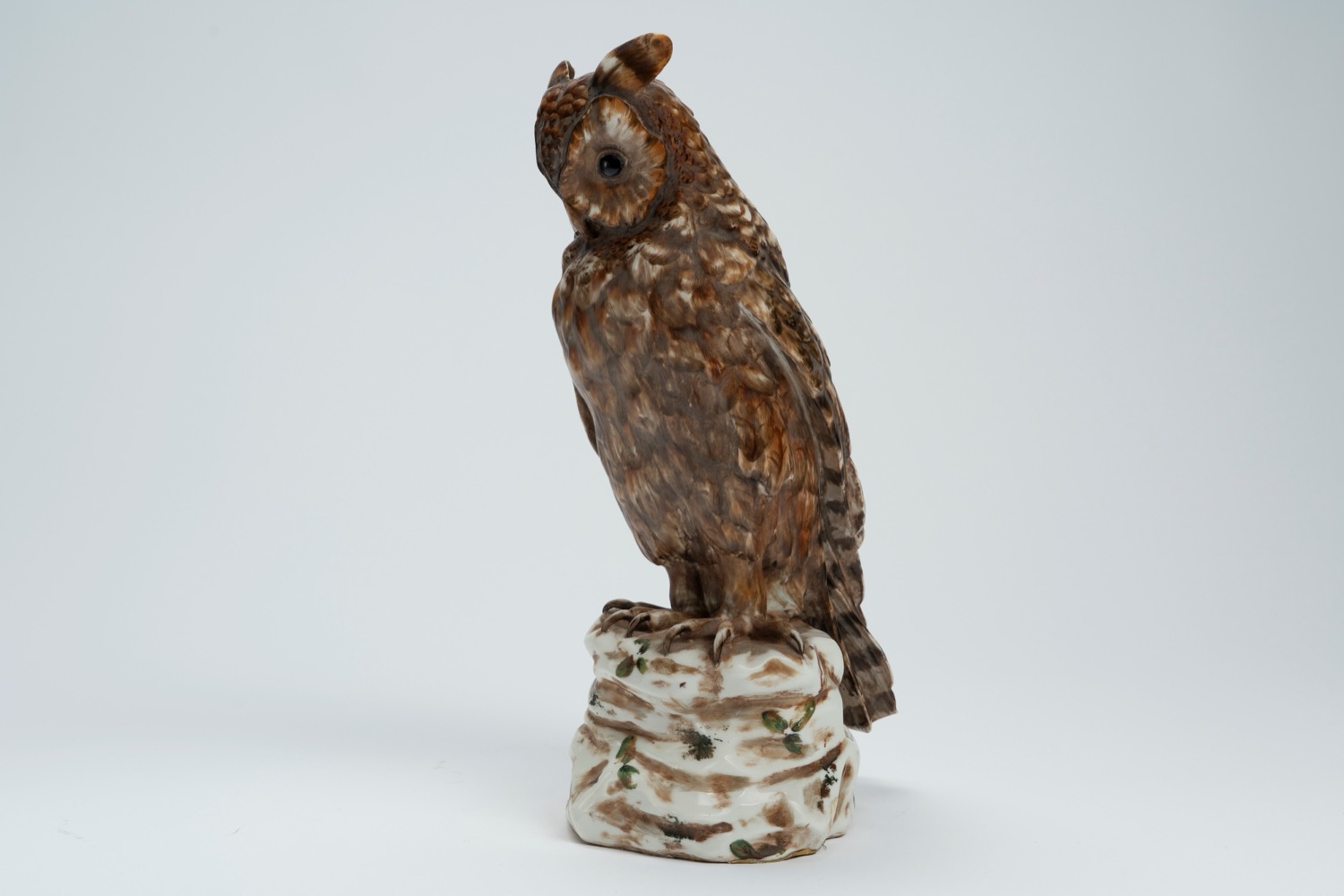 Gufo su roccia in ceramica policroma, secolo XIX/XX