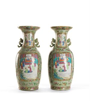COPPIA DI VASI Coppia di vasi cinesi decorati su fondo verde, epoca fine XIX secolo H 62 cm A pair of Chinese vases decorated with a green background