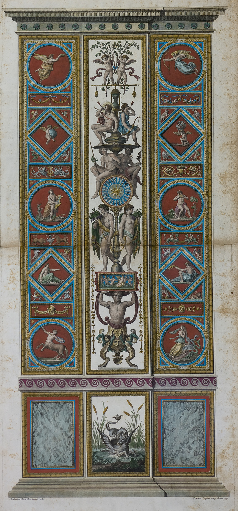 Dalla serie di stampe raccolte in tre parti sotto il titolo di ""Loggie di Rafaello nel Vaticano"", ossia la riproduzione completa a stampa delle pitture dei pilastri delle Logge Vaticane ideate e affrescate da Raffaello, incise a Roma da Giovanni Ottaviani e da Giovanni Volpato tra il settimo e l'ottavo decennio del Settecento. L'opera presenta i segni del tempo.