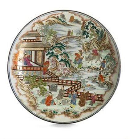 PORCELLANA Piatto in porcellana policroma con scene di vita popolare. Cina epoca XX secolo Diam 55 cm Porcelain plate with polychrome scenes of everyday life. Vintage twentieth century China
