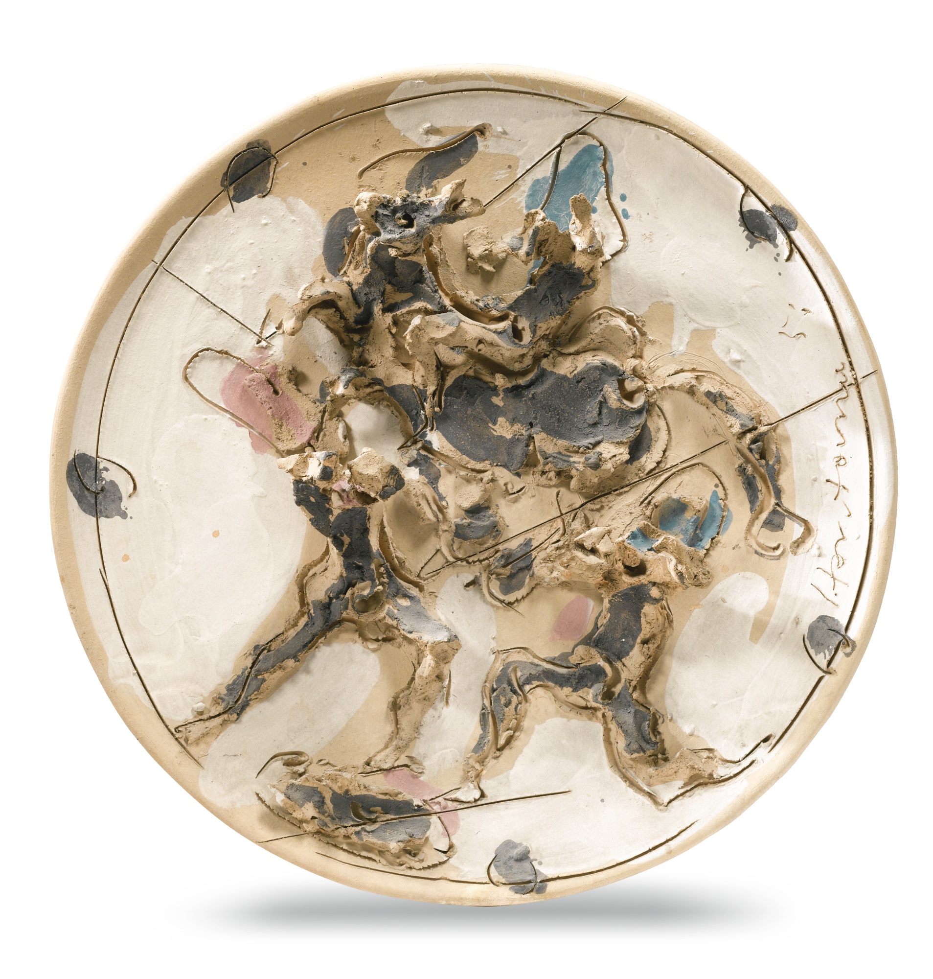 Lucio Fontana 1899 - 1968 BATTAGLIA firmato e datato 55 terracotta dipinta diam. cm 47x10 Authentication Opera registrata presso la Fondazione Lucio Fontana, Milano Provenance Galleria Giorgio Marconi, Milano Ivi acquistato dall'attuale proprietario