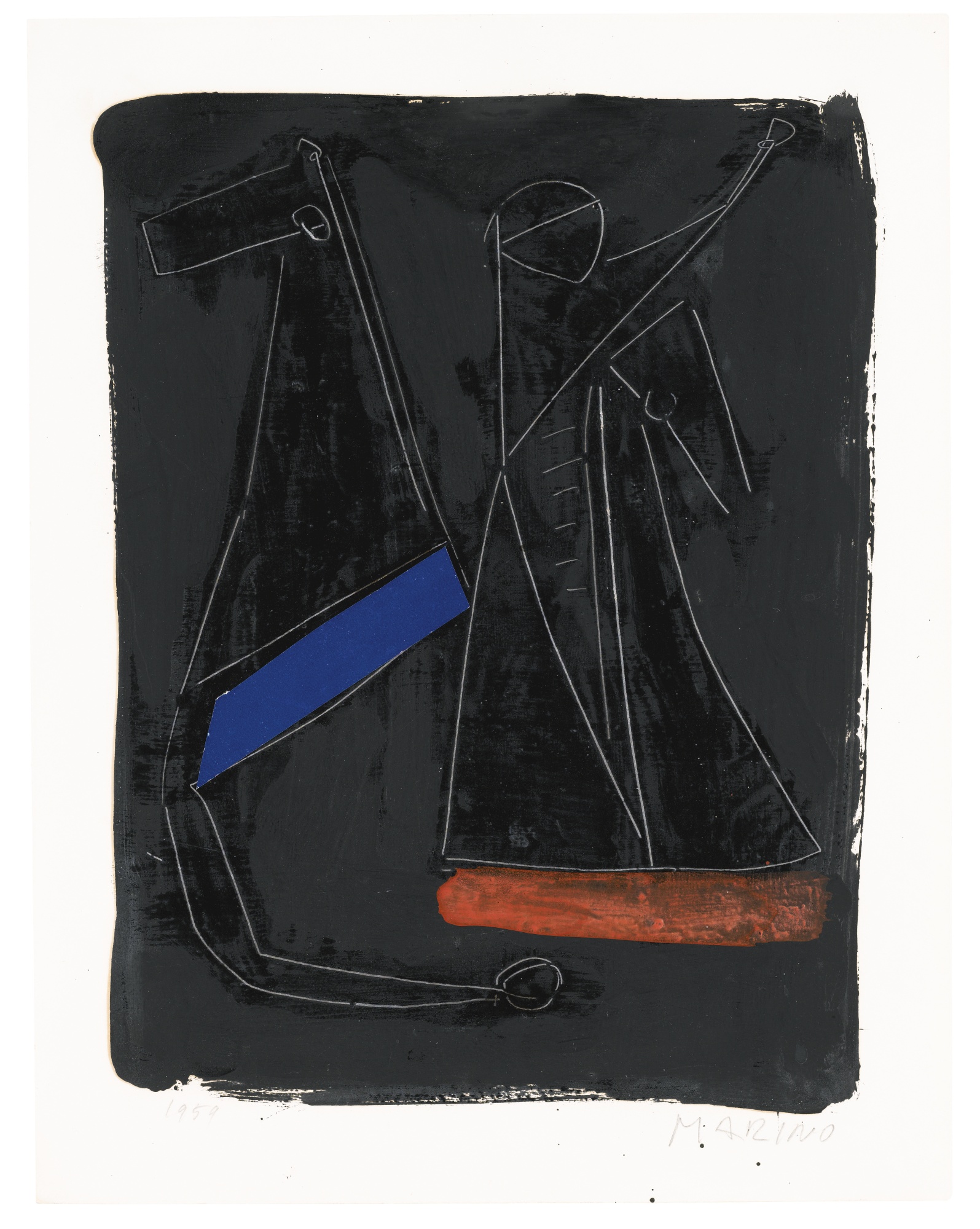 Marino Marini 1901 - 1980 CAVALLI E CAVALIERE firmato e datato 1959 olio e collage su carta cm 42x32 Authentication Opera registrata presso la Fondazione Marino, Marini, Pistoia, col n. 662 L'opera è accompagnata da certificato su fotografia rilasciato dalla Fondazione Marino Marini, Pistoia Exhibited Courmayeur, Galleria Arte Nuova, Maestri del '900, 1974