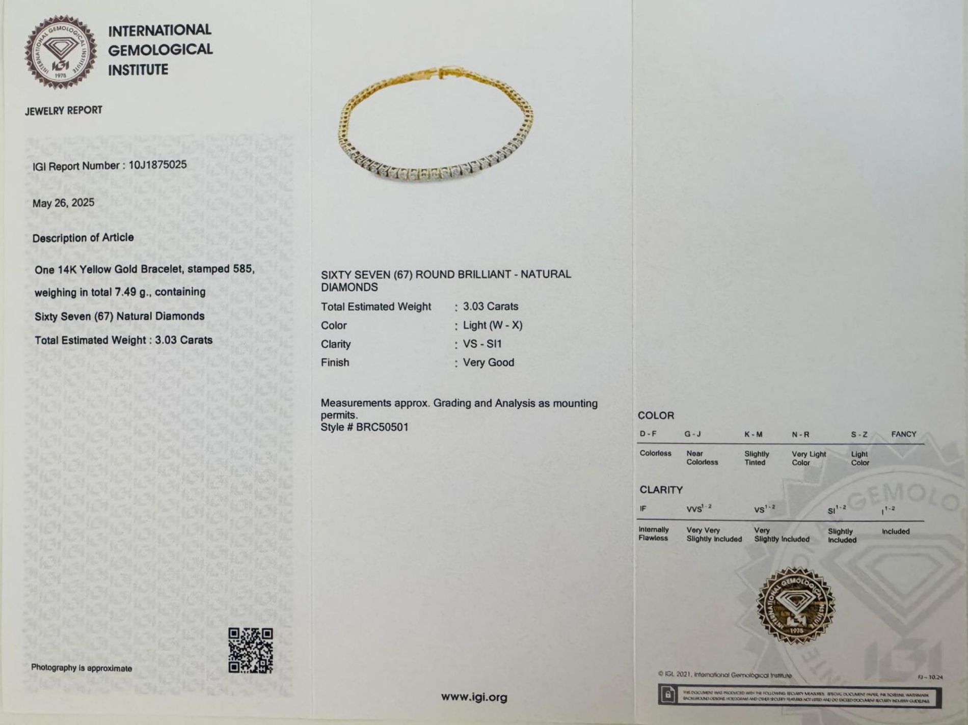 BRACCIALE TENNIS IN ORO GIALLO 14K 7,49 GR CON DIAMANTI NATURALI 3,03 CT COLORE LIGHT W-X PUREZZA VS-SI - MISURA 18CM - BRC50501 - COMMISSIONE D’ASTA 25%