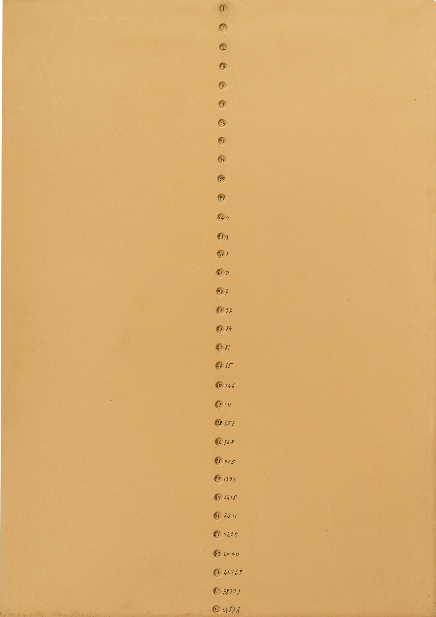 Mario Merz 1925 - 2003 FIBONACCI firmato, intitolato, iscritto 1202 e datato 1970 inchiostro su cartoncini sovrapporti cm 100x70 Eseguito nel 1970 Authentication Opera archiviata presso l'Archivio Mario Merz, Torino, con il n. 2096/1970/CT L'opera è accompagnata da certificato su fotografia rilasciato dall'Archivio Mario Merz, Torino
