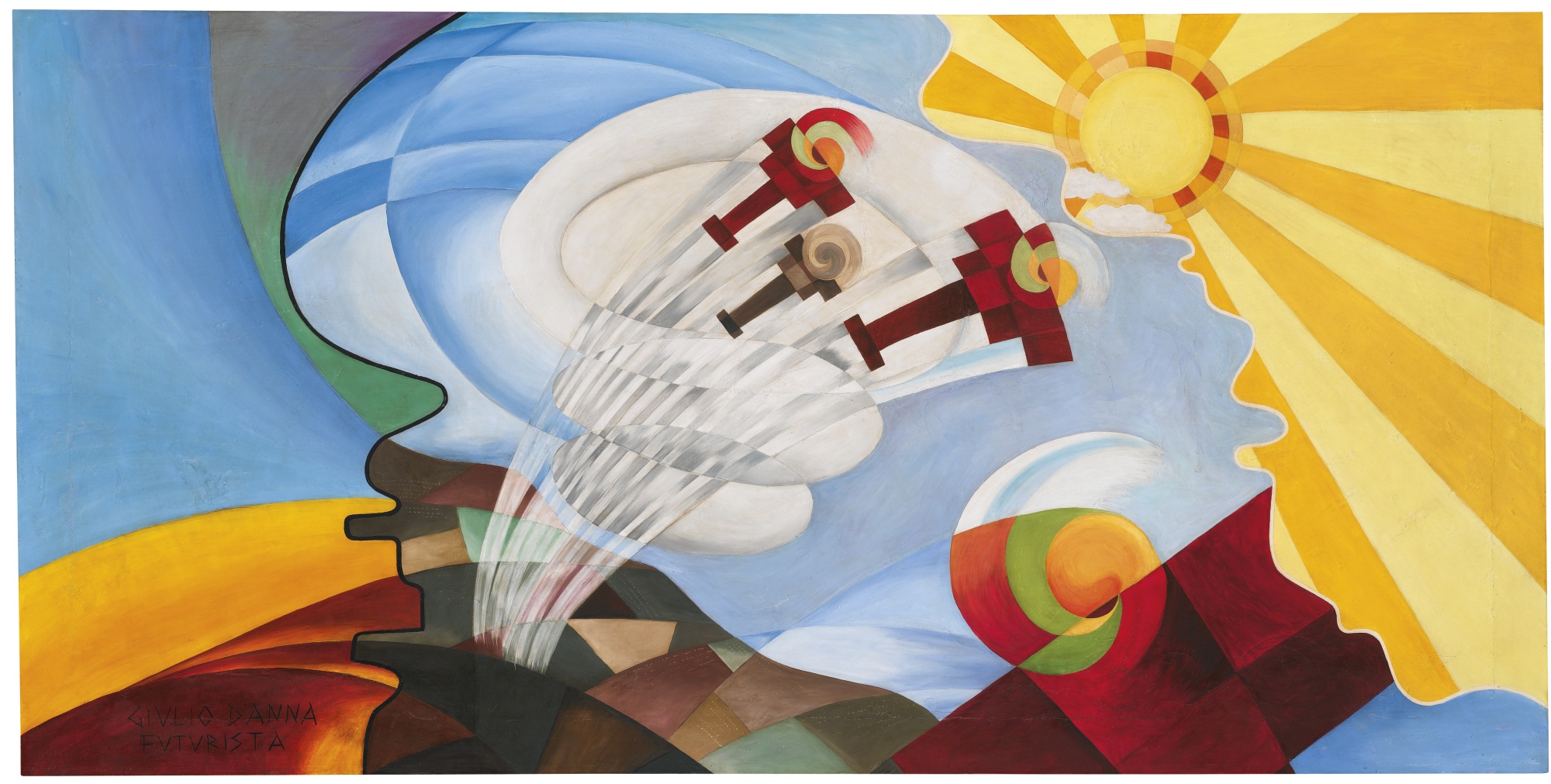 Giulio D'Anna 1908-1978 EVOLUZIONI SUI CAMPI firmato Giulio D'Anna futurista tempera su tela cm 60x120 Eseguito negli anni Trenta Authentication Opera registrata presso gli Archivi del Futurismo in Sicilia, con il n. AFS 207 L'opera è accompagnata da certificato su fotografia rilasciato dagli Archivi del Futurismo in Sicilia Provenance Collezione Petrina, Catania Ivi acquisito dall’attuale proprietario