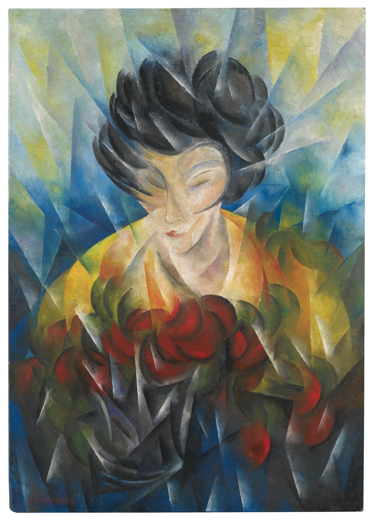 Roberto Marcello Baldessari 1894-1965 DONNA + FIORI ROSSI firmato olio su tela cm 85x60 Eseguito nel 1915-1916 circa Authentication Opera registrata presso l'Archivio Unico per il Catalogo delle opere futuriste di Marcello Baldessari, Rovereto, a cura di Maurizio Scudiero, con il n. B15-87 L'opera è accompagnata da certificato su fotografia rilasciato dall'Archivio Unico per il Catalogo delle opere futuriste di Marcello Baldessari, Rovereto Provenance Berlino, Einsblatter Kunst Galerie