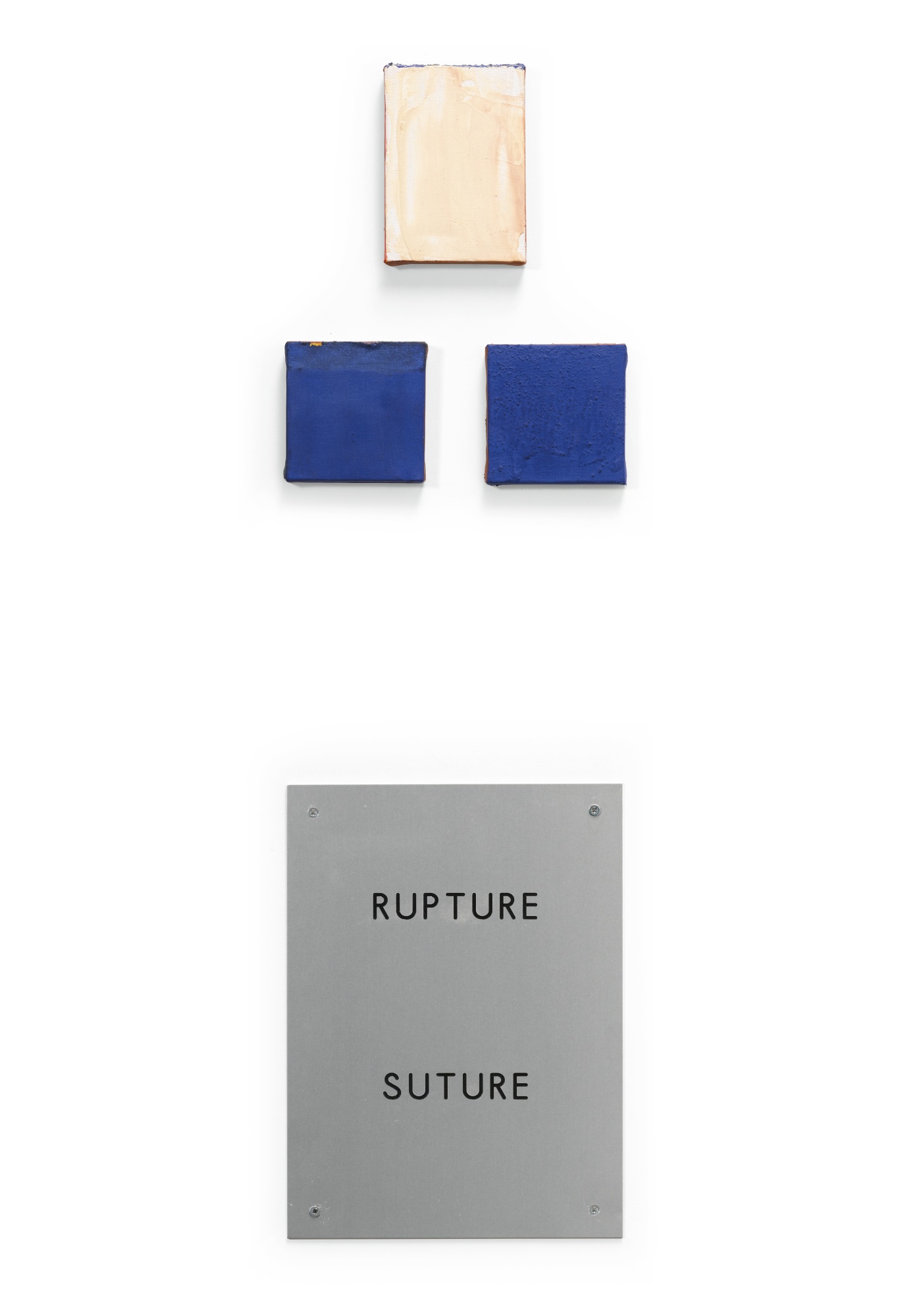 Rose Frain ASSISI SUTURE (MEANWHILE) firmato e datato 2000 sul retro olio, tempera murale e lastra di alluminio incisa (4 elementi) cm 7x10; cm 7x7; cm 7x7; cm 23x17, installazione misure variabili Exhibited Roma, Studio d’arte Contemporanea Pino Casagrande Rosa a cura di J. Benci e V. Bruschi, luglio 2000.