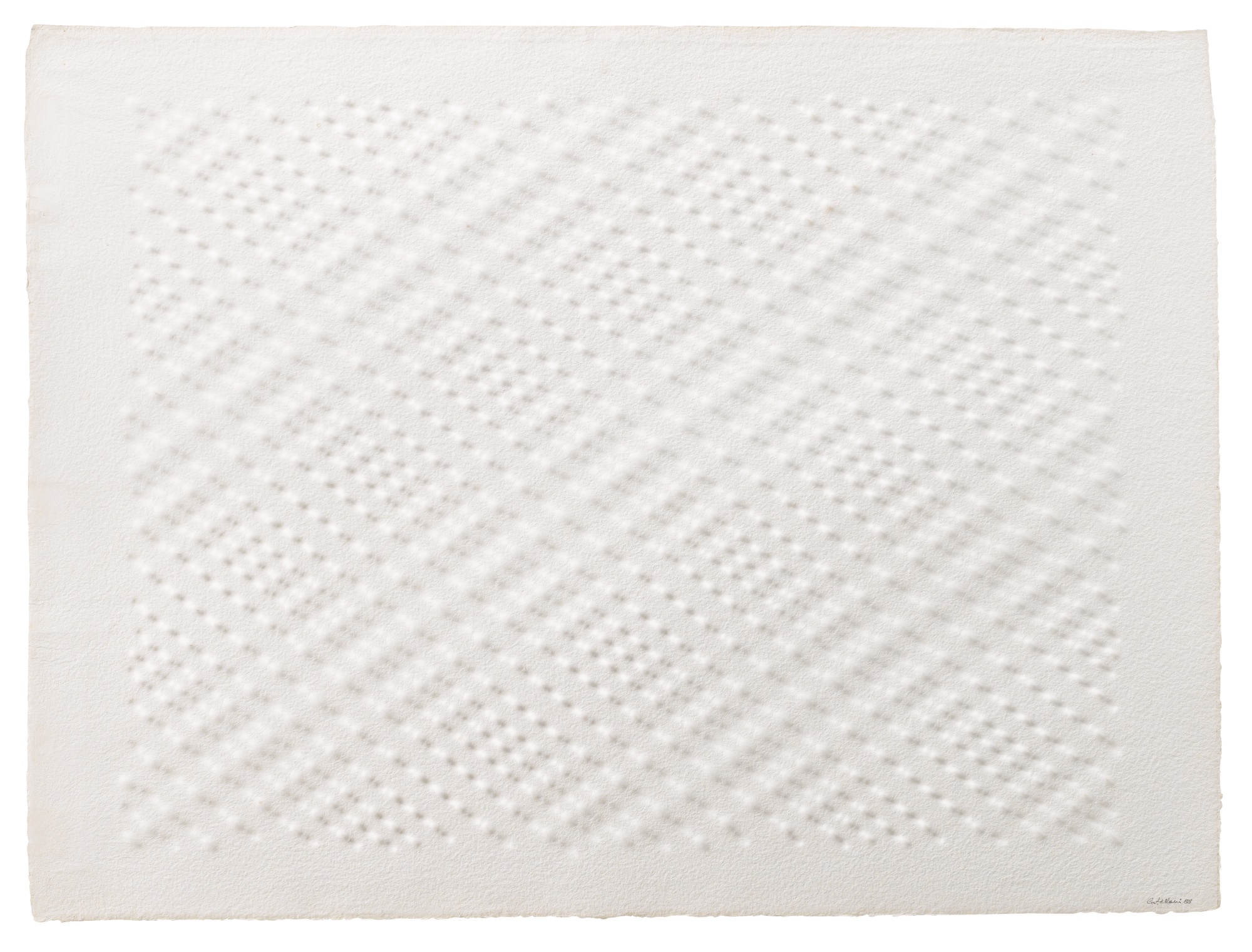 Enrico Castellani N. 1930 SENZA TITOLO firmato e datato 88 rilievo su carta cm 88x118 Authentication Opera registrata presso l'Archivio Castellani, Milano, con il n. 88-008-C L'opera è accompagnata da certificato su fotografia rilasciato dall'Archivio Castellani, Milano Provenance Arte Silva, Seregno Collezione privata, Roma Exhibited Parma, Galleria Niccoli, Enrico Castellani, 1988 Roma, Palazzetto Art Gallery, Lo spazio totale. Astrattismo-Spazialismo-Minimalismo-Arte Povera-Performance, 2012, p. 28, illustrato a colori