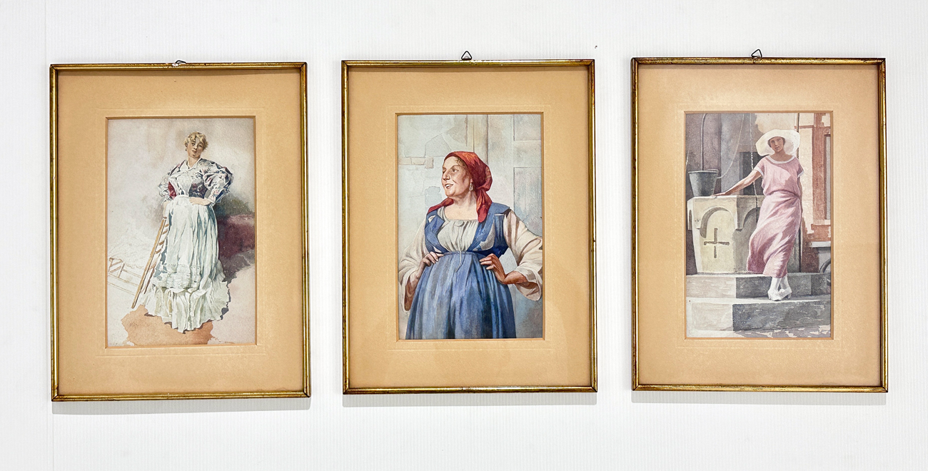 Lotto unico di 3 acquerelli su carta raffiguranti popolane