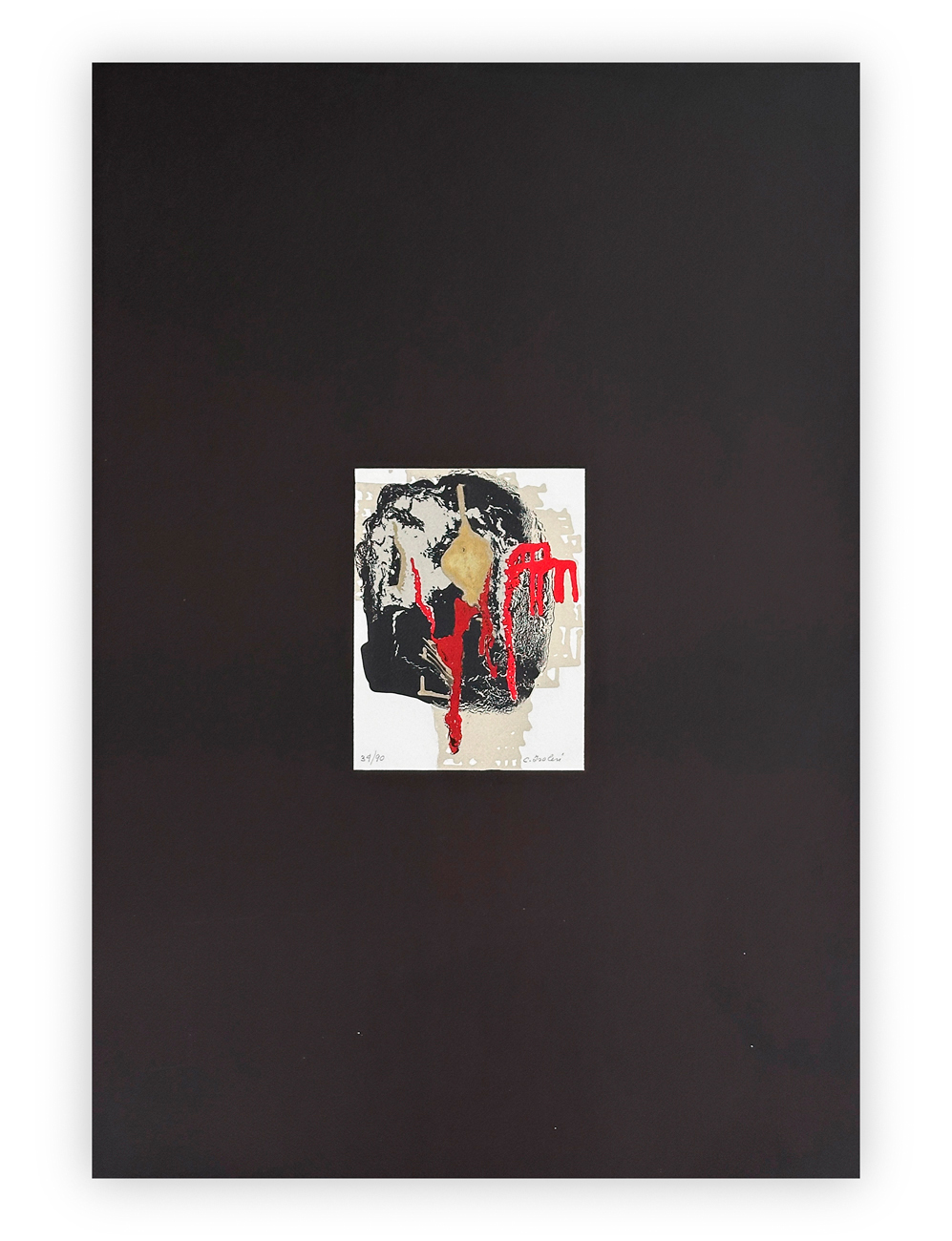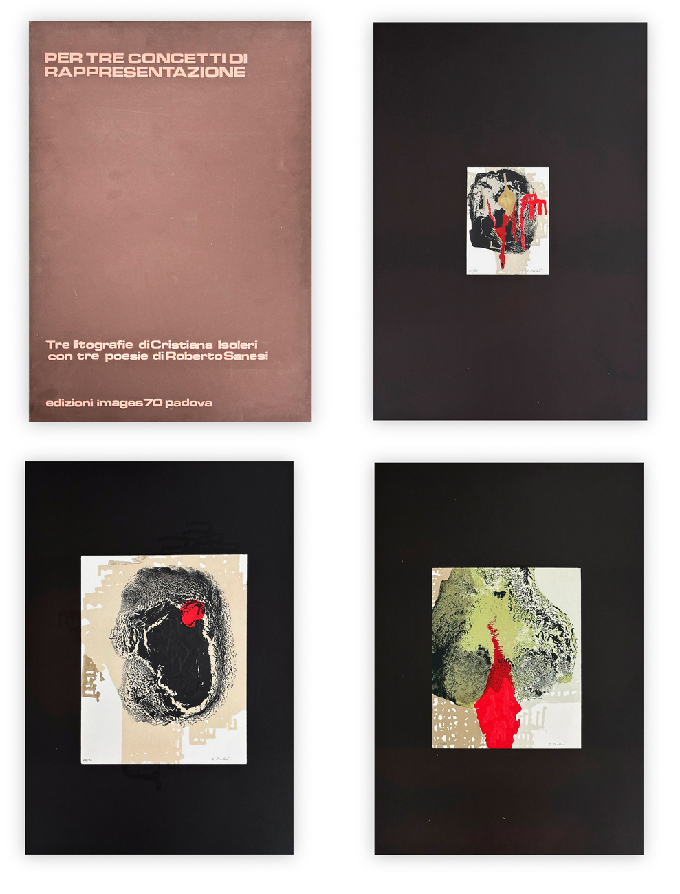 Cartella contenente 3 poesie di Roberto Sanesi illustrate da 3 litografie di Cristiana Isoleri, ciascuna recante firma e numerazione (Esemplare 79/90) a matita al fronte