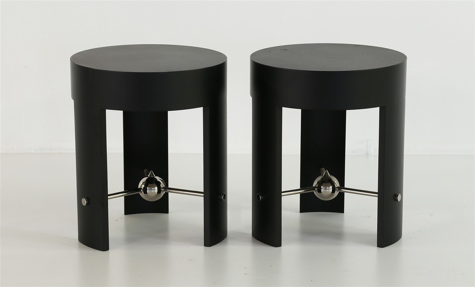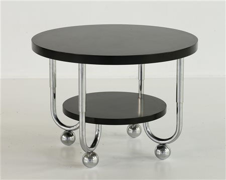 MANIFATTURA ITALIANA DEL XX SECOLO Tavolino rotondo e coppia di comodini. Acciaio cromato, legno. Cm 70,00 x 51,00 x 70,00. Comodini cm 47x40x40 cm. Cornice presente