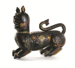 SCULTURA Gatto ligneo di scuola malese , epoca XIX secolo Legno scolpito e decorato Provenienza: collezione Laurent e Giorgio Colombari, Palazzo Villanis Torino