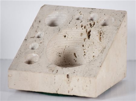 MARI ENZO (n. 1932) Per Danese, Milano. Portapenne. Travertino. Cm 10,00 x 8,00. Timbro Danese sotto la base. Presenti lievi sbeccature al marmo.