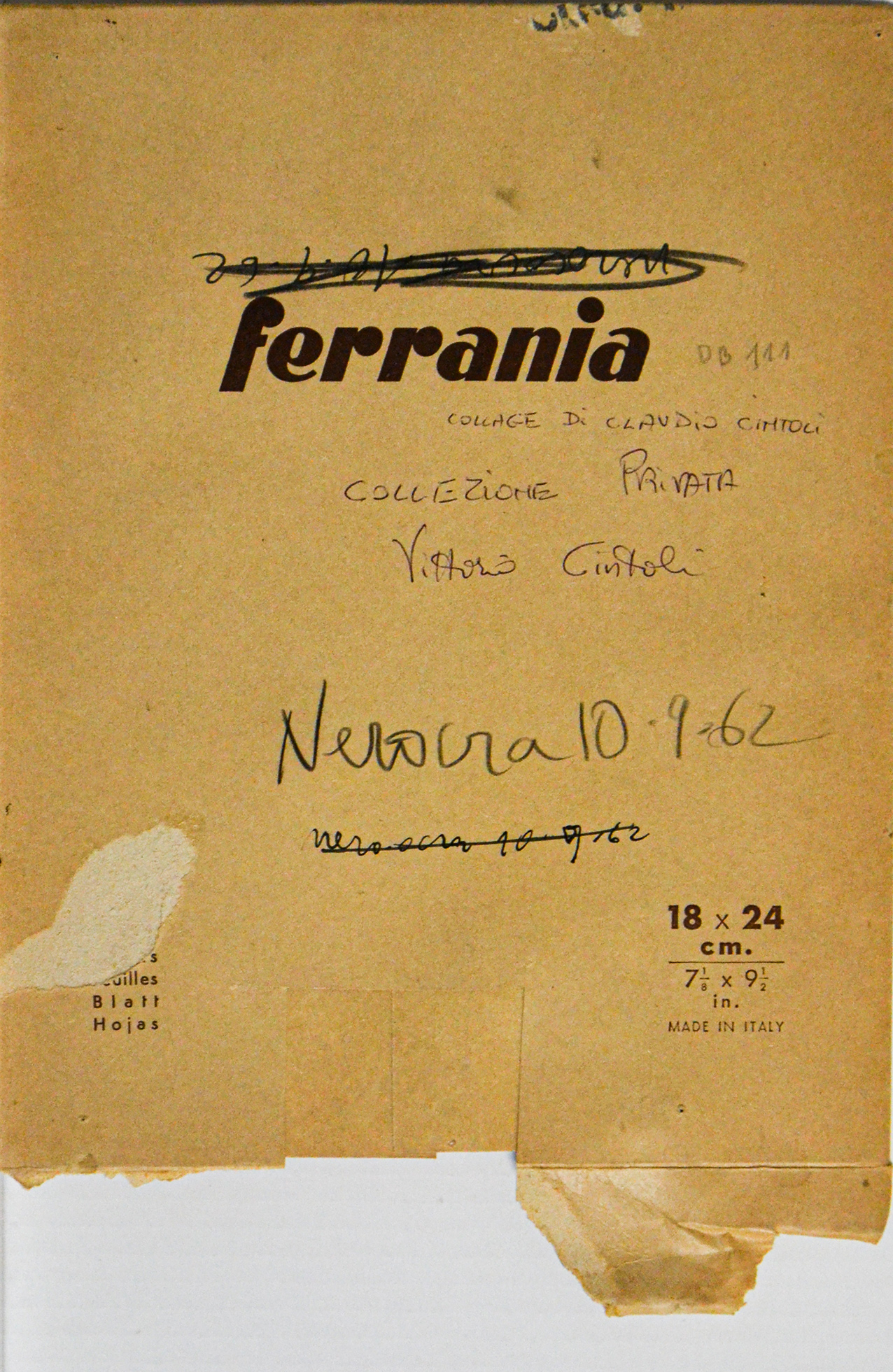 Titolo e datazione di mano dell'Artista ed indicazione di provenienza (collezione privata Vittorio Cintoli), tecnica e numero di archivio DB111