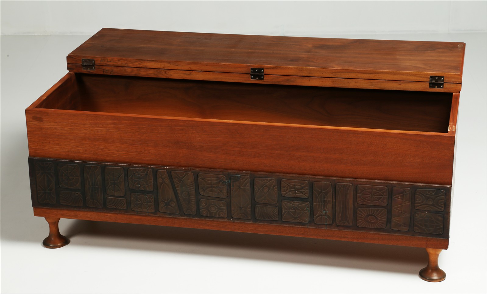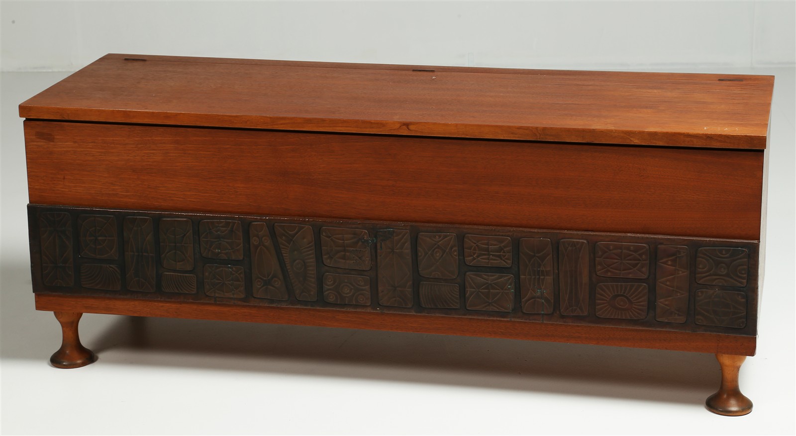SANT' AMRBOGIO E DE BERTI Cassapanca. Legno e rame. Cm 41,00 x 118,00 x 46,00. Legno e rame sbalzato.