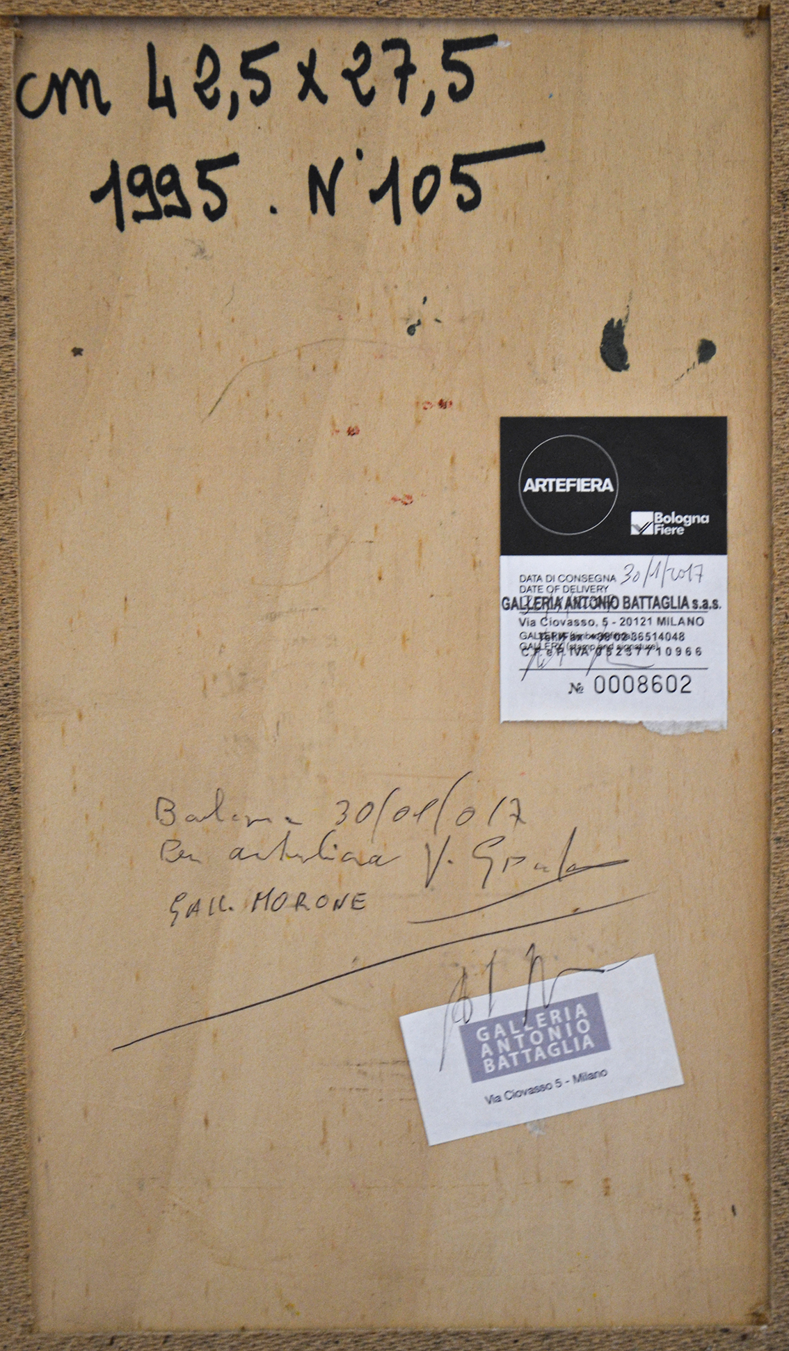 - Etichetta firmata della galleria di provenienza "Galleria Antonio Battaglia, Milano"
