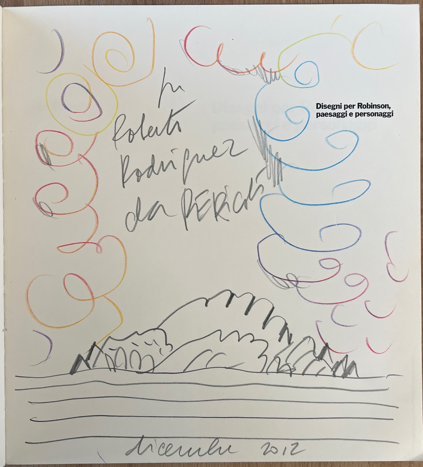 Reca un disegno realizzato a grafite e pastelli colorati, con firma, datazione (Dicembre 2012) e dedica dell'Artista all'interno
