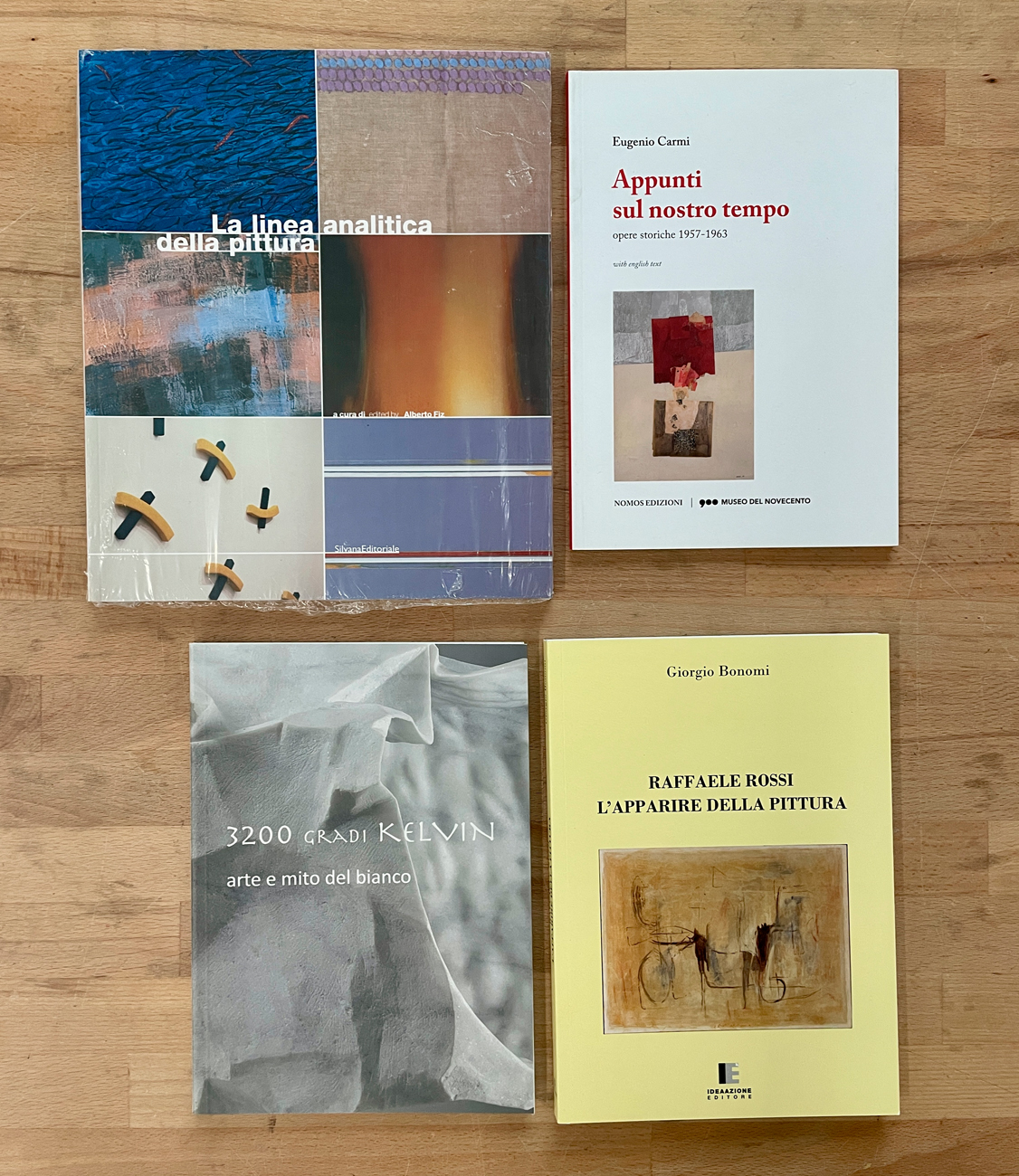 Catalogo riccamente illustrato a cura di Alberto Fiz con opere di Marco Gastini, Giorgio Griffa, Claudio Olivieri, Carmengloria Morales, Pino Pinelli, Claudio Verna