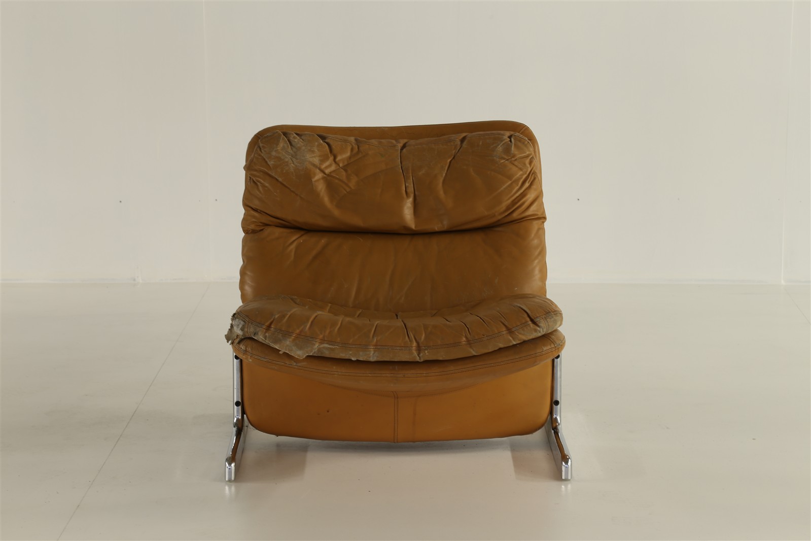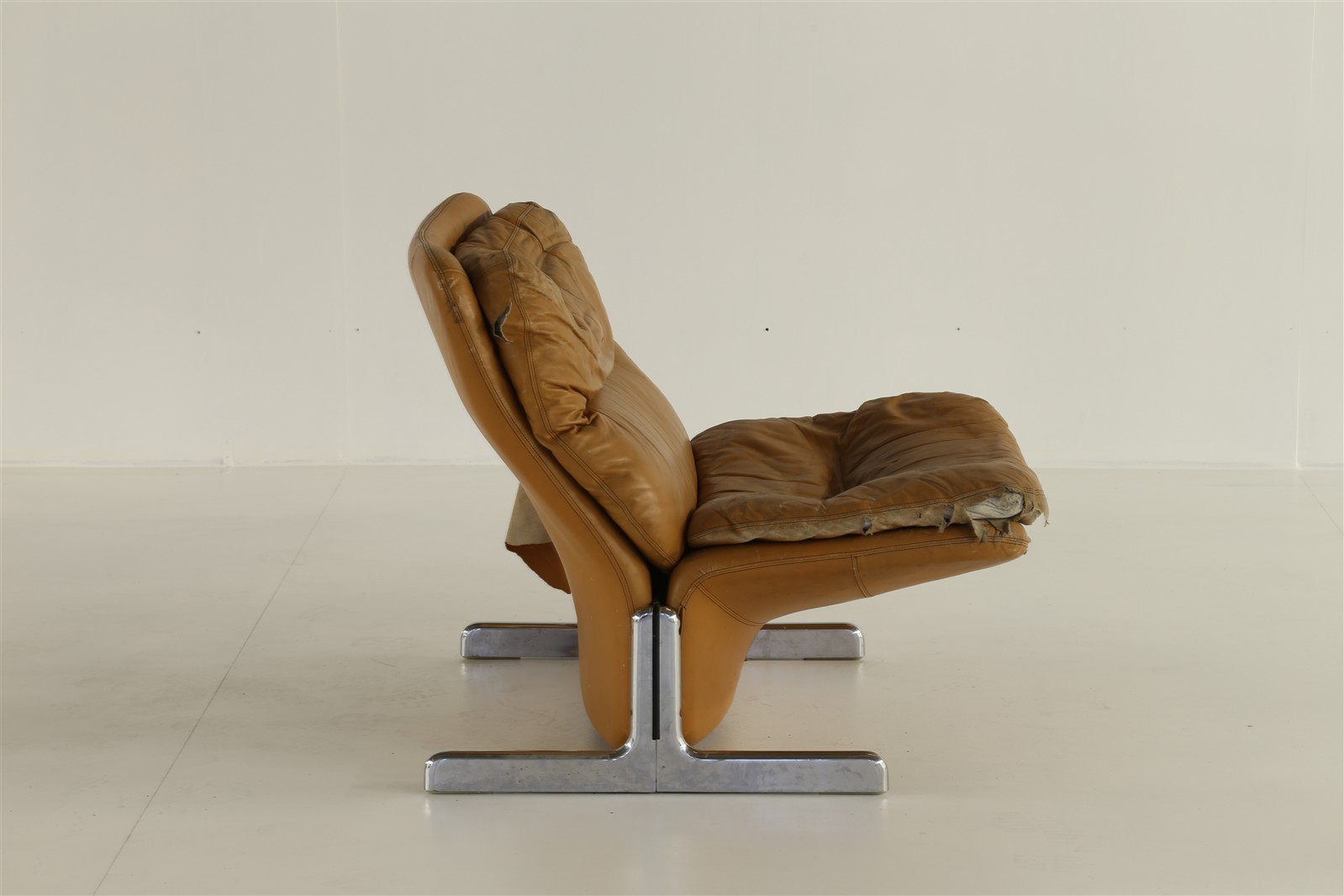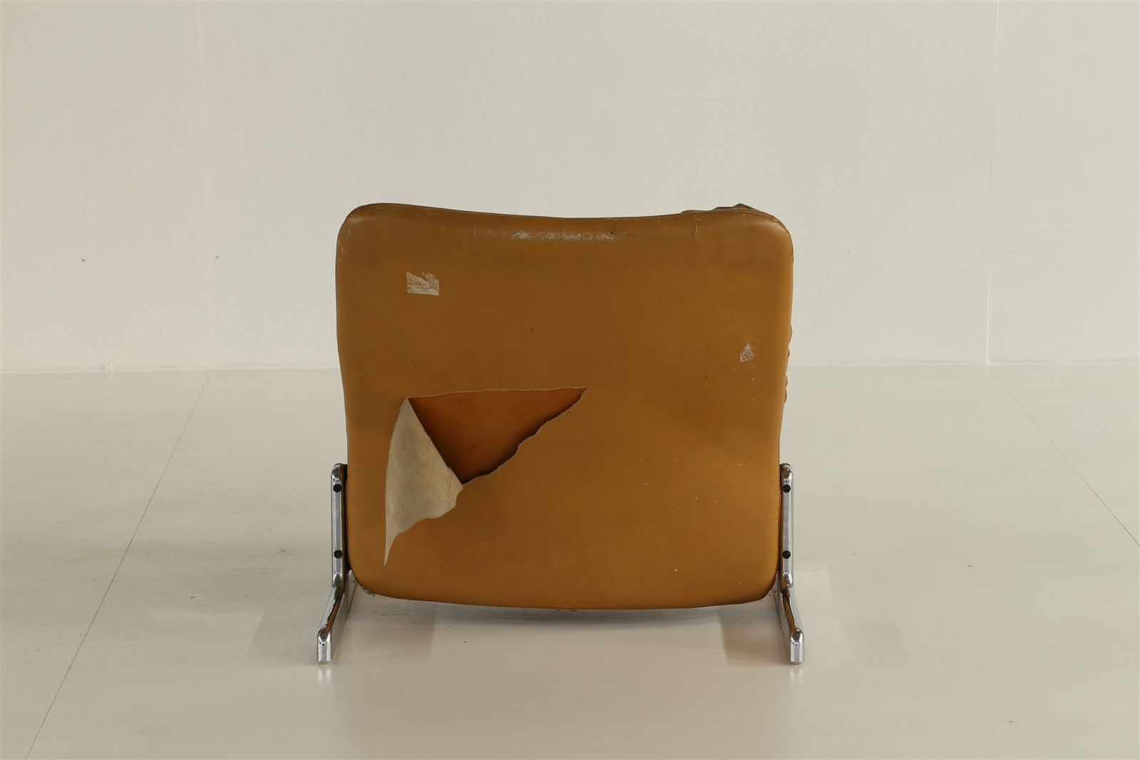 DAL LAGO ALBERTO Per Brunati. Poltrona Pellicano. Metallo cromato, pelle. Cm 79,00 x 75,00 x 79,00. Presenti strappi. Anni '70.