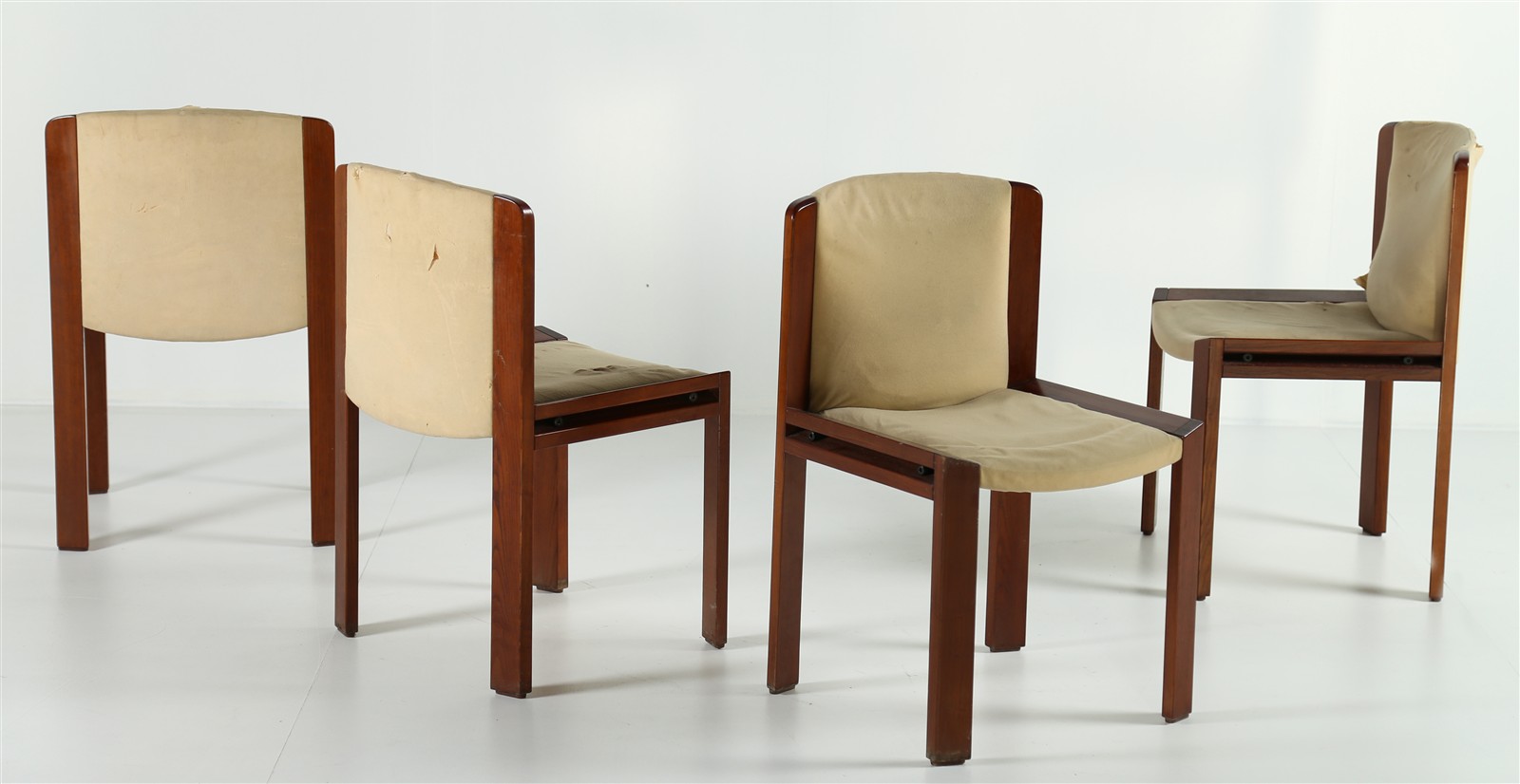 COLOMBO JOE (1930 - 1971) Lotto composto da n.4 sedie. Legno e tessuto. Cm 45,00 x 75,00 x 49,00. Le sedute sono da rifoderare.