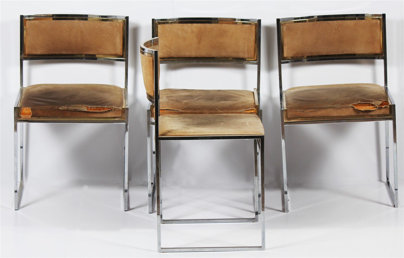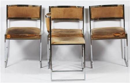MANIFATTURA DEL XX SECOLO Lotto composto da n. 4 sedie. Ottone e pelle. Cm 48,00 x 77,00 x 42,00. Ottone cromato e seduta rivestita in pelle di daino.