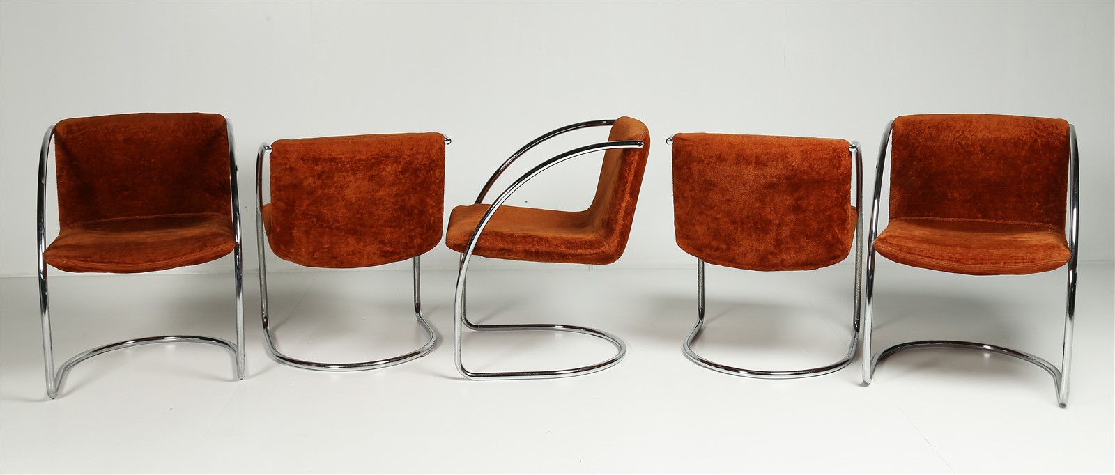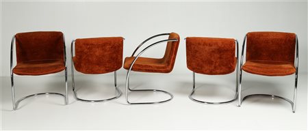 OFFREDI GIOVANNI (n. 1927) Lotto composto da n.5 sedie modello Lens cb. Metallo cromato e tessuto. Cm 55,00 x 75,00 x 55,00. Produzione Saporiti 1968.