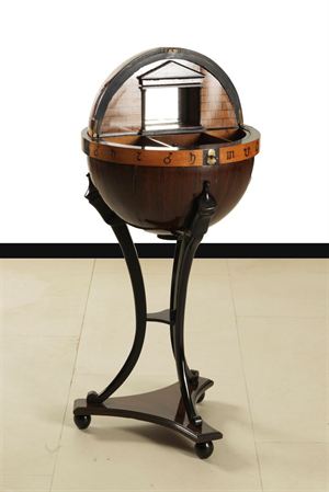 TAVOLINO Tavolino a forma di globo in palissandro e intarsi in varie essenze raffiguranti i segni dello zodiaco, Austria metà XIX secolo H 121 cm Globe-shaped table in rosewood and marquetry in various woods depicting the signs of the zodiac, Austria mid-nineteenth century