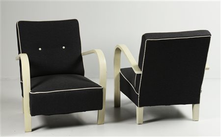 MANIFATTURA ITALIANA DEL XX SECOLO Coppia di poltrone. Legno e tessuto. Cm 68,00 x 78,00 x 80,00. Anni '40. Restaurate.