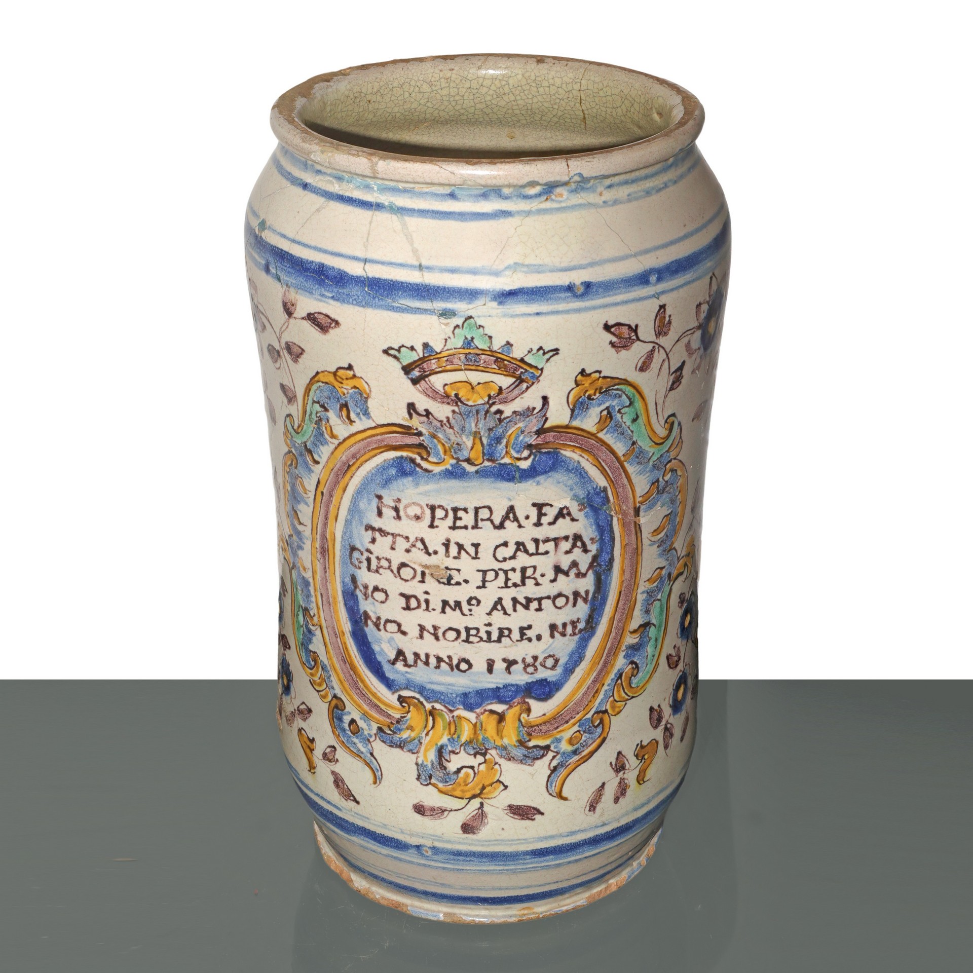 Antonio Lo Nobile - Grande cilindro in maiolica di Caltagirone decorato a motivi floreali, 1780 h cm 33 Sul retro firmato Antonio Lo Nobile e datato entro cartiglio. Piccole filature