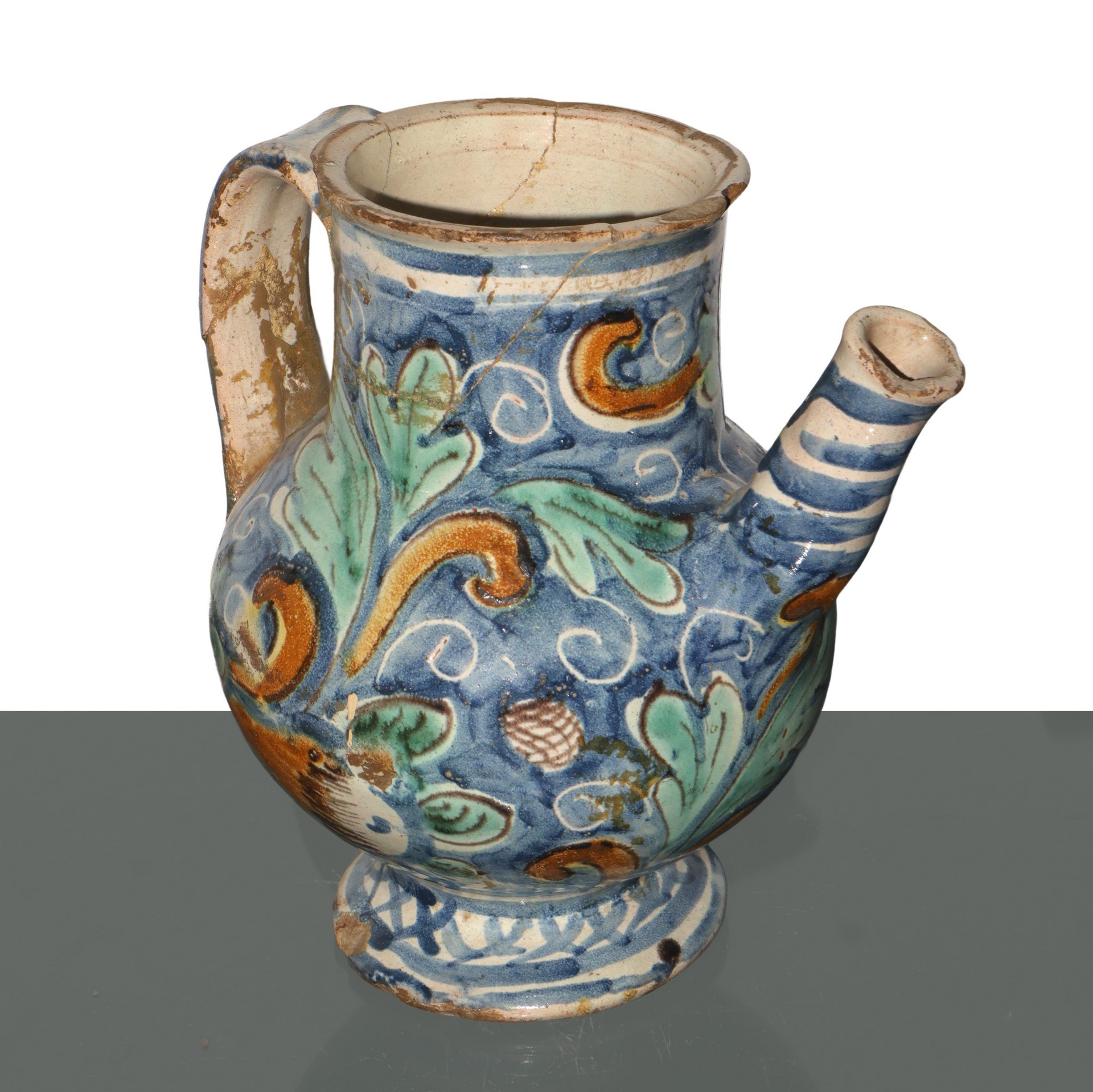 Versatoio con manico in maiolica di Caltagirone decorato a motivi vegetali, 18° secolo h cm 20 Presenti incollature e restauri