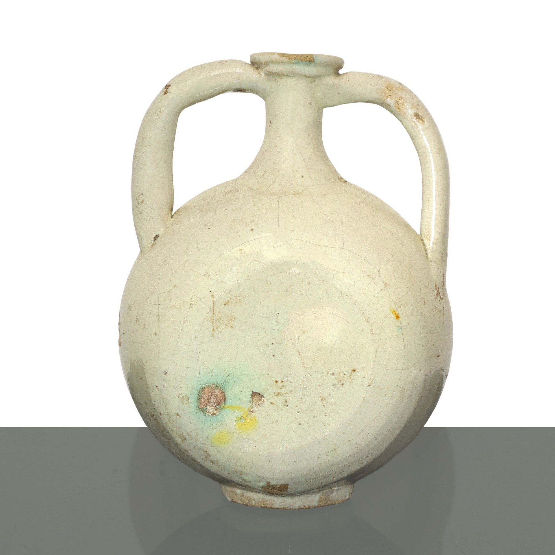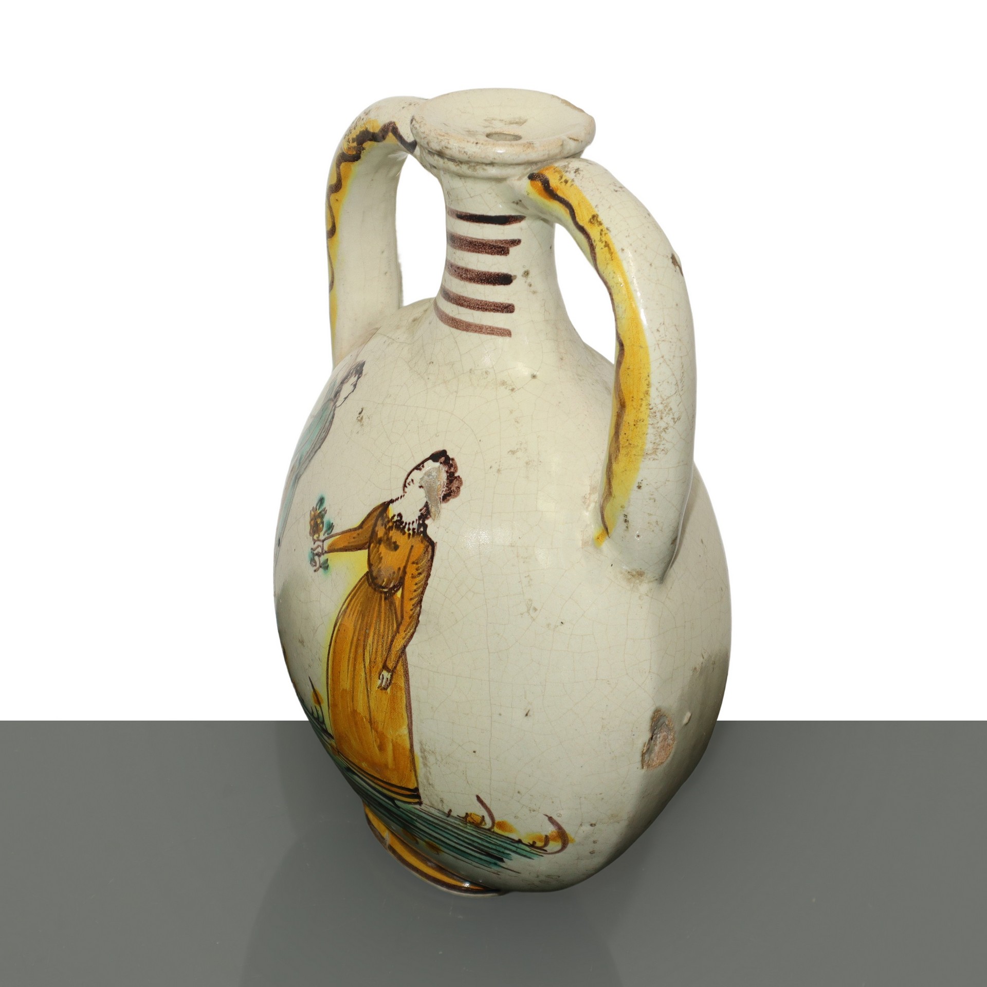 Borraccia in maiolica di Caltagirone dipinta policroma con figura femminile ritratta da un pittore, 19° secolo h cm 25 diametro cm 19 Colori giallo verde e manganese su pasta gialla