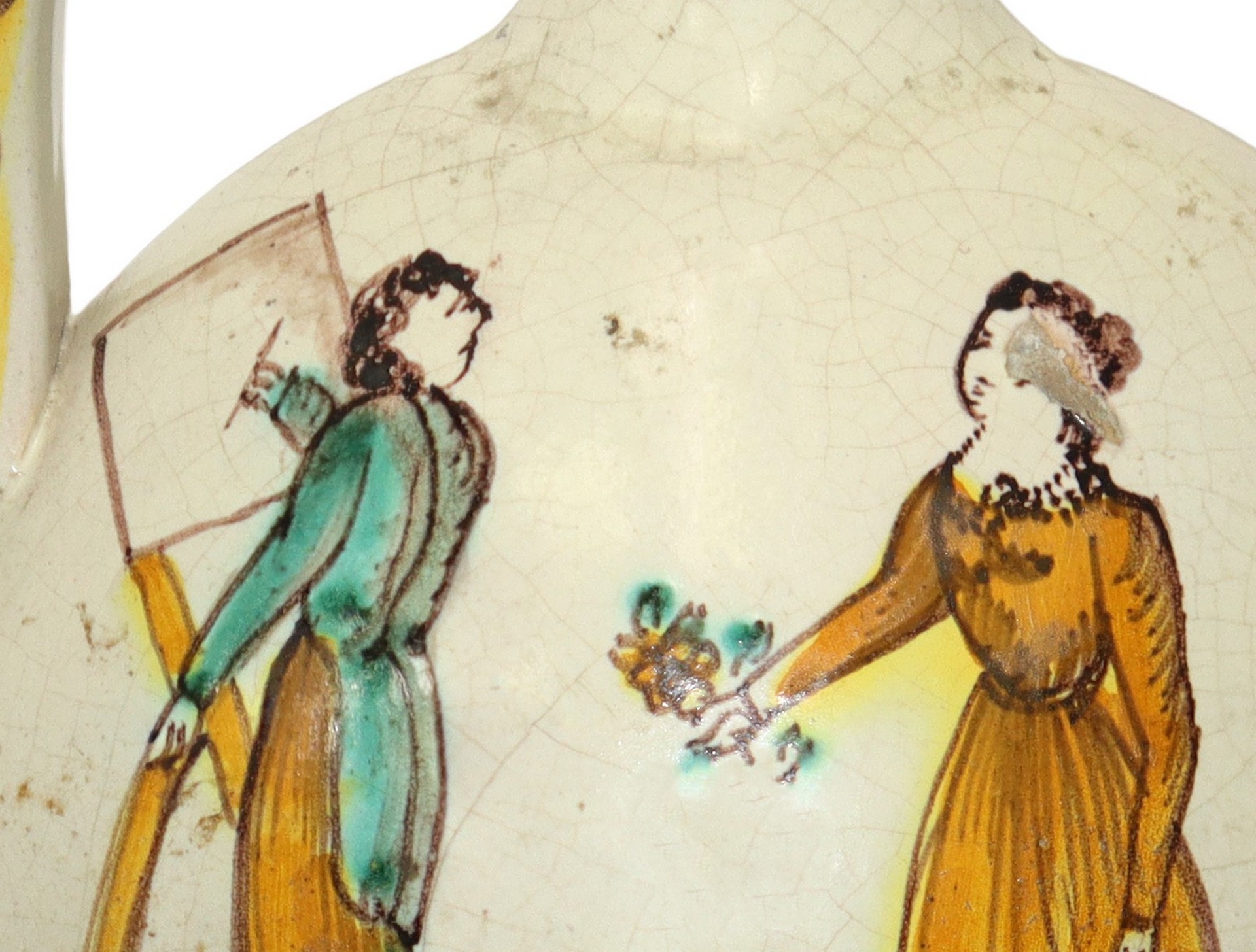 Borraccia in maiolica di Caltagirone dipinta policroma con figura femminile ritratta da un pittore, 19° secolo