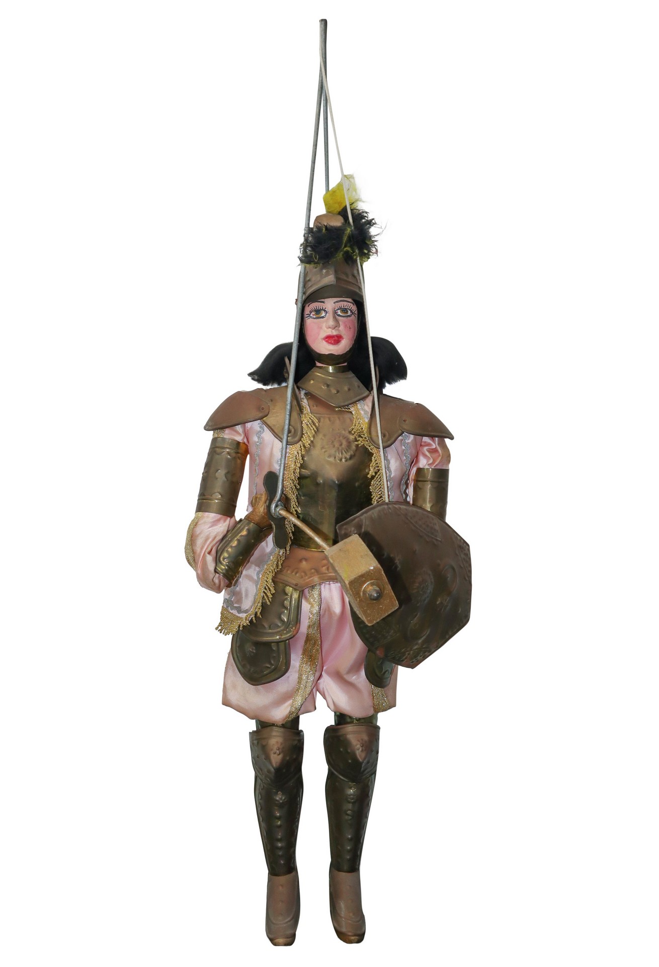Pupo siciliano con armatura in metallo e vestiti in tessuto rosa
