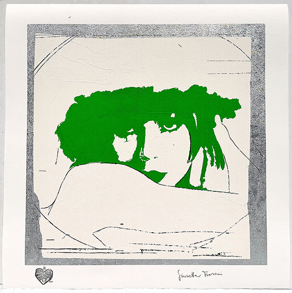 GIOSETTA FIORONI, "Doppio Liberty" Verde Luminoso Serigrafia materica con pigmento Verde luminoso. Applicazione di carta velina e foglio argento realizzata a mano. Opera su carta Pescia in cotone da 350 grammi, formato 50x50 realizzata in 125 esemplari per tutto il mondo, dei quali 100 numerati da 1/100 a 100/100 in numeri arabi, 25 numerati da I/XXV a XXV/XXV in numeri romani e alcune P.A. per l'artista. Firma in basso a destra Numerazione in basso a sinistra. L'opera è stata realizzata in occasione del 50° anniversario di Spirale Milano Editore, 50x50 cm