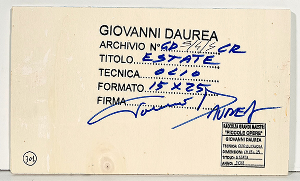 DAUREA GIOVANNI, "Estate" olio su tavola anno 2018, archivio GDS/4/SCR, Titolo tecnica dimensione n°archivio e firma a retro, 15x25 cm