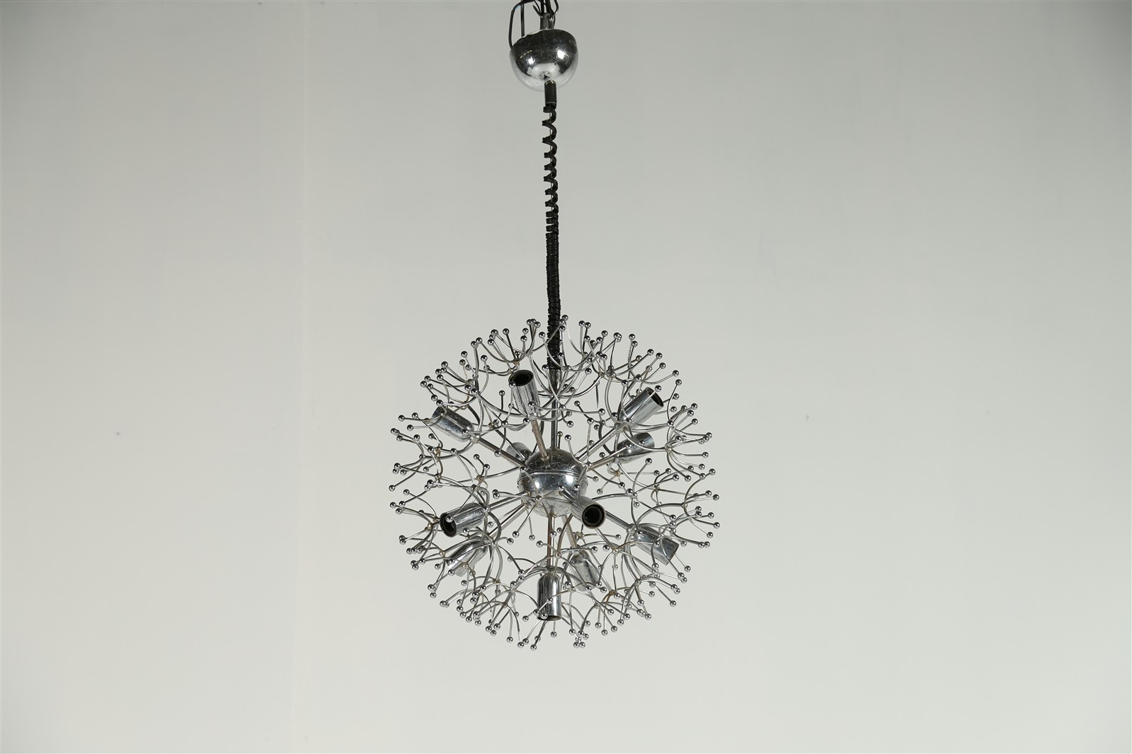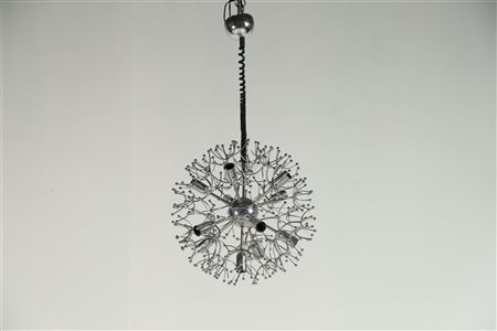 MANIFATTURA ITALIANA DEL XX SECOLO Lampadario Spuntnik. Metallo cromato. Cm 50,00 x 98,00. Sagim, Mogliano Veneto. Anni '70.